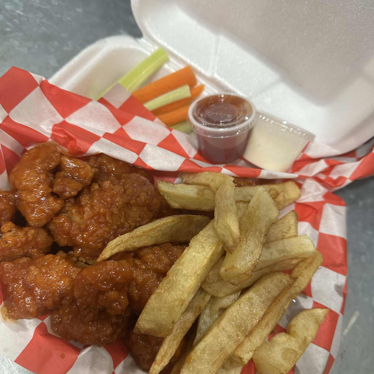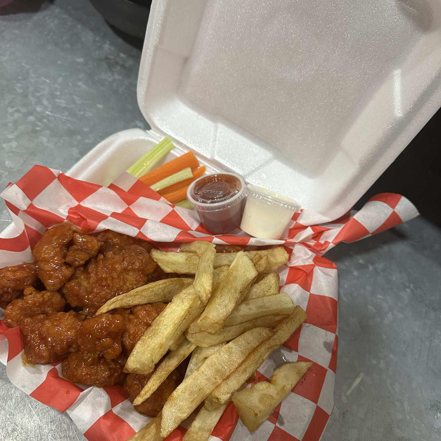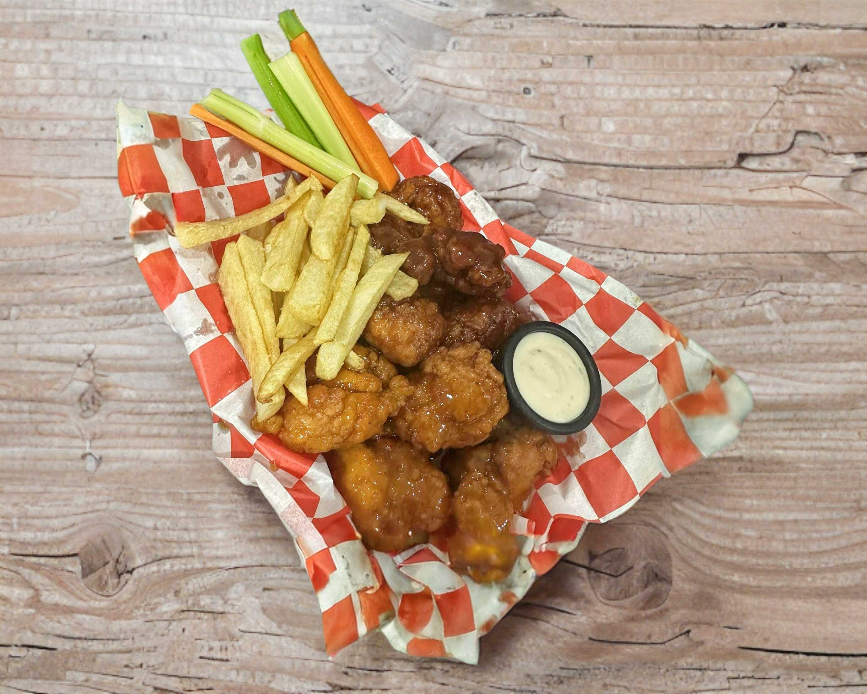 Boneles, papas, aderezo, catsup, apio, zanahoria