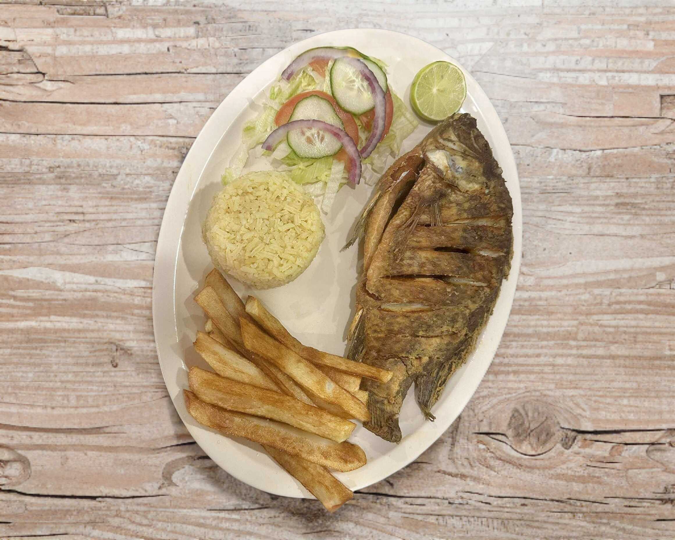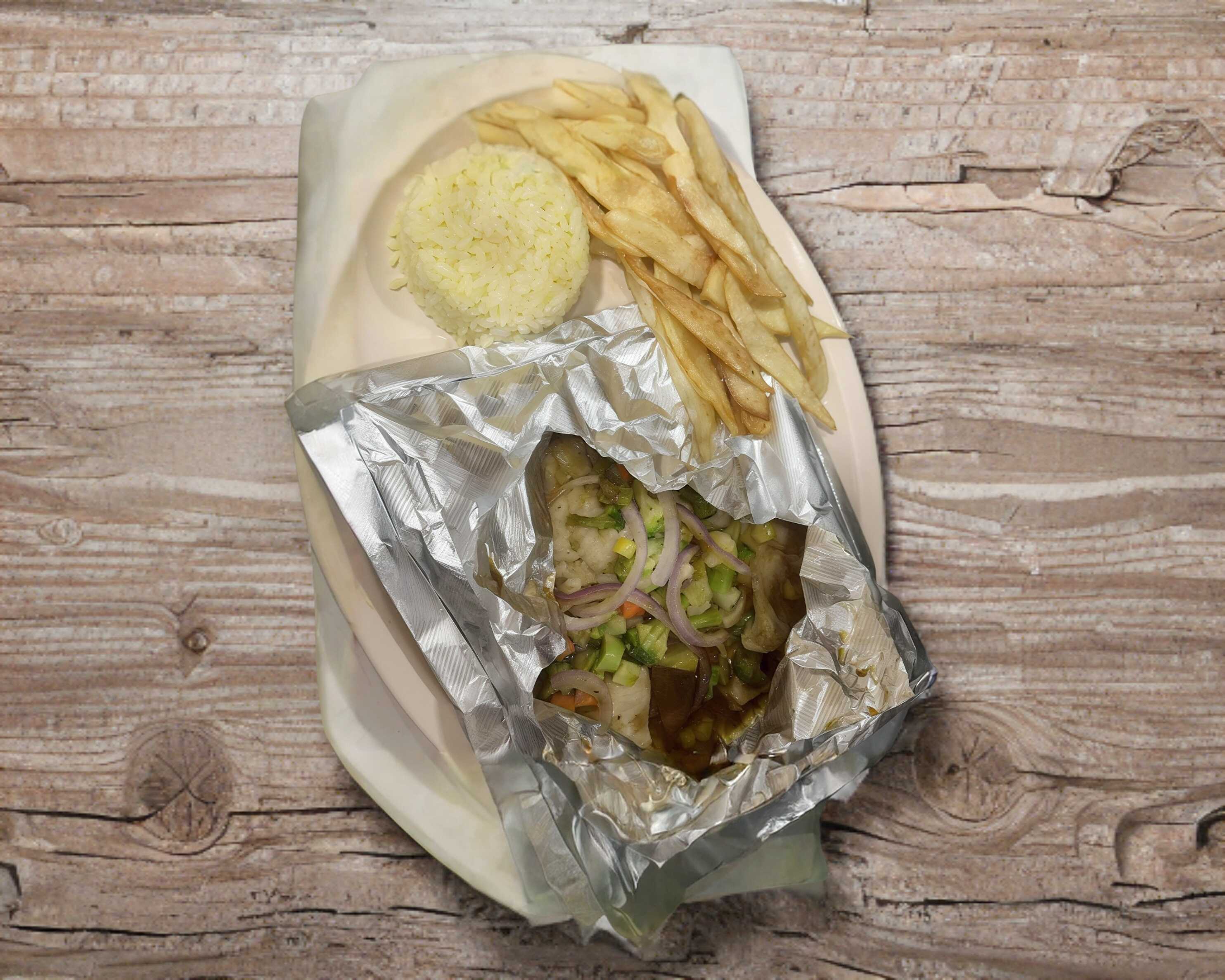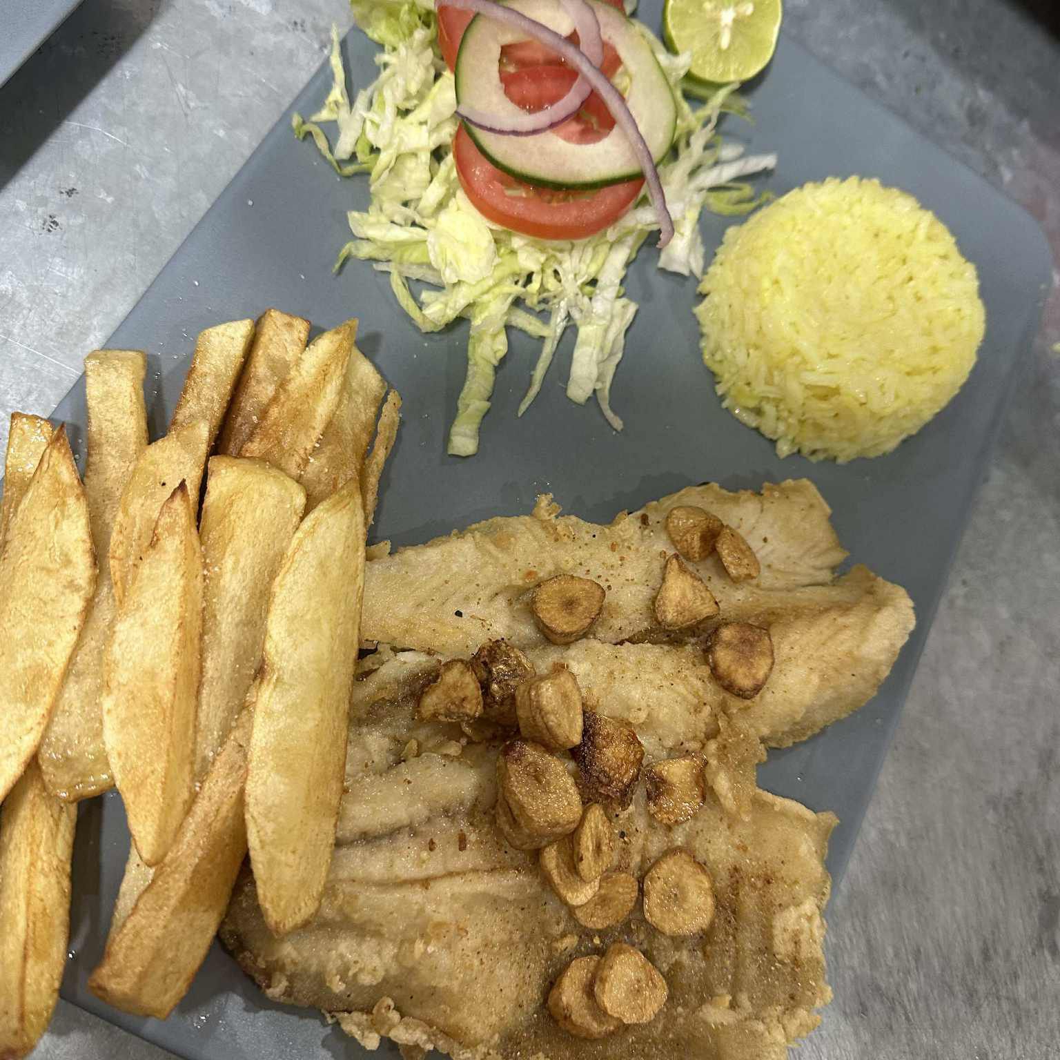 filete de pescado,arroz,ensalada,pan,papas