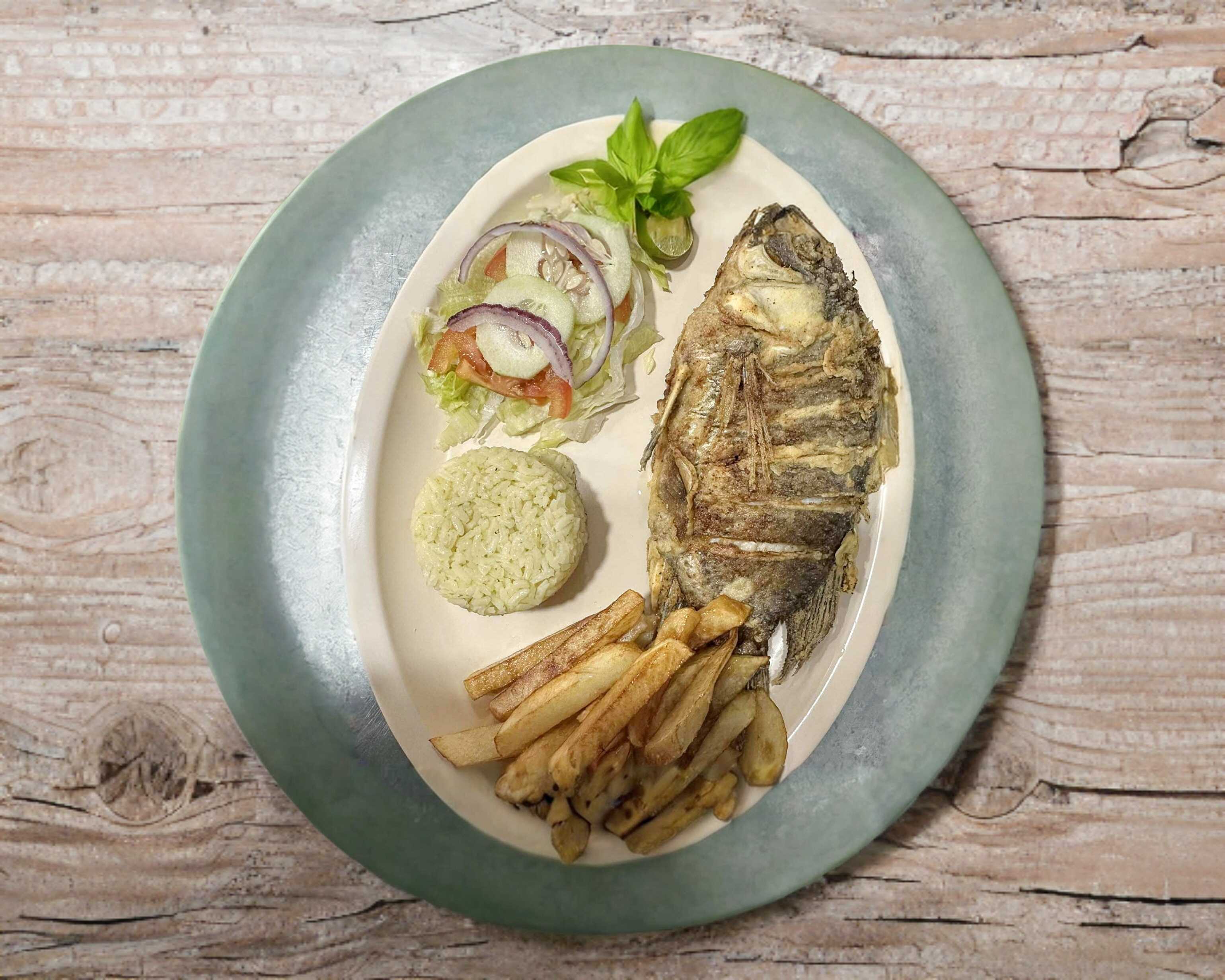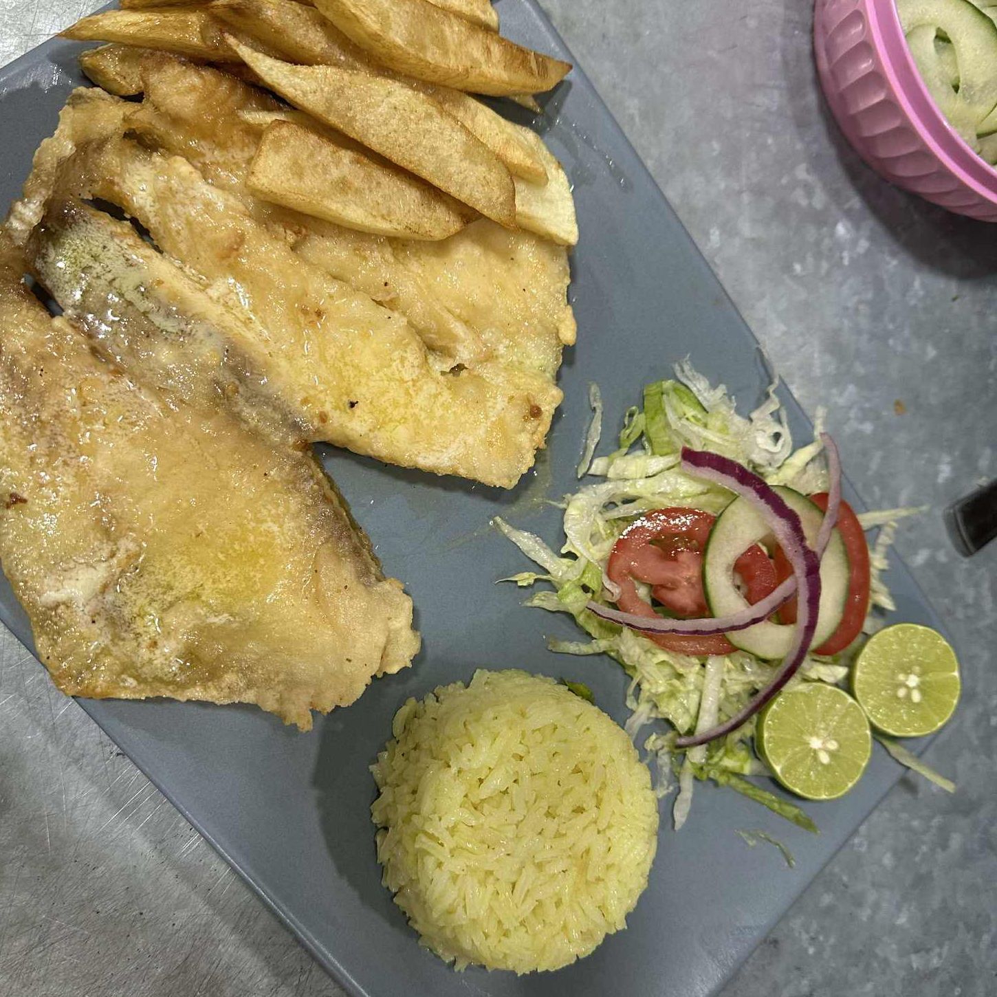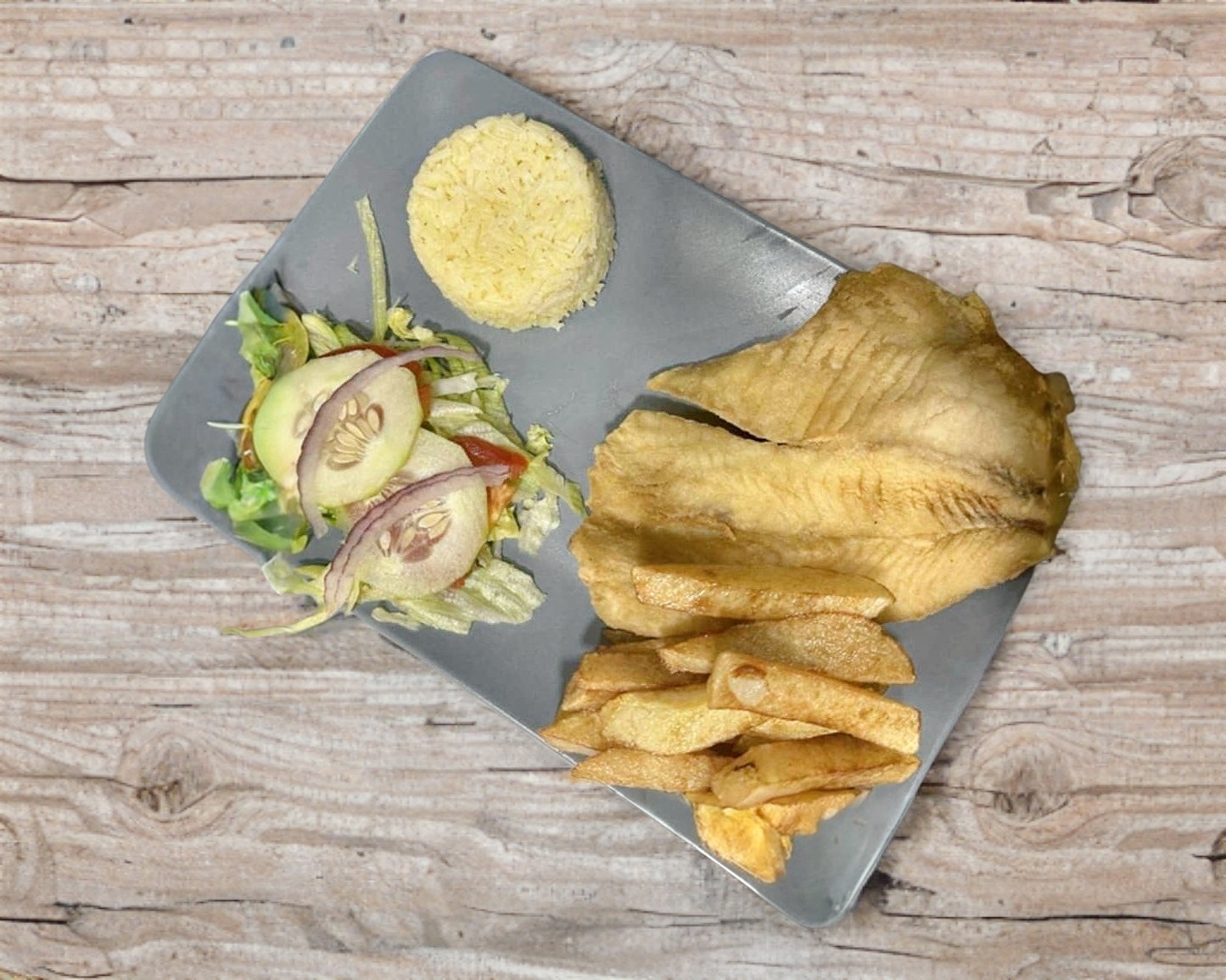 filete de pescado,arroz,ensalada,pan,papas