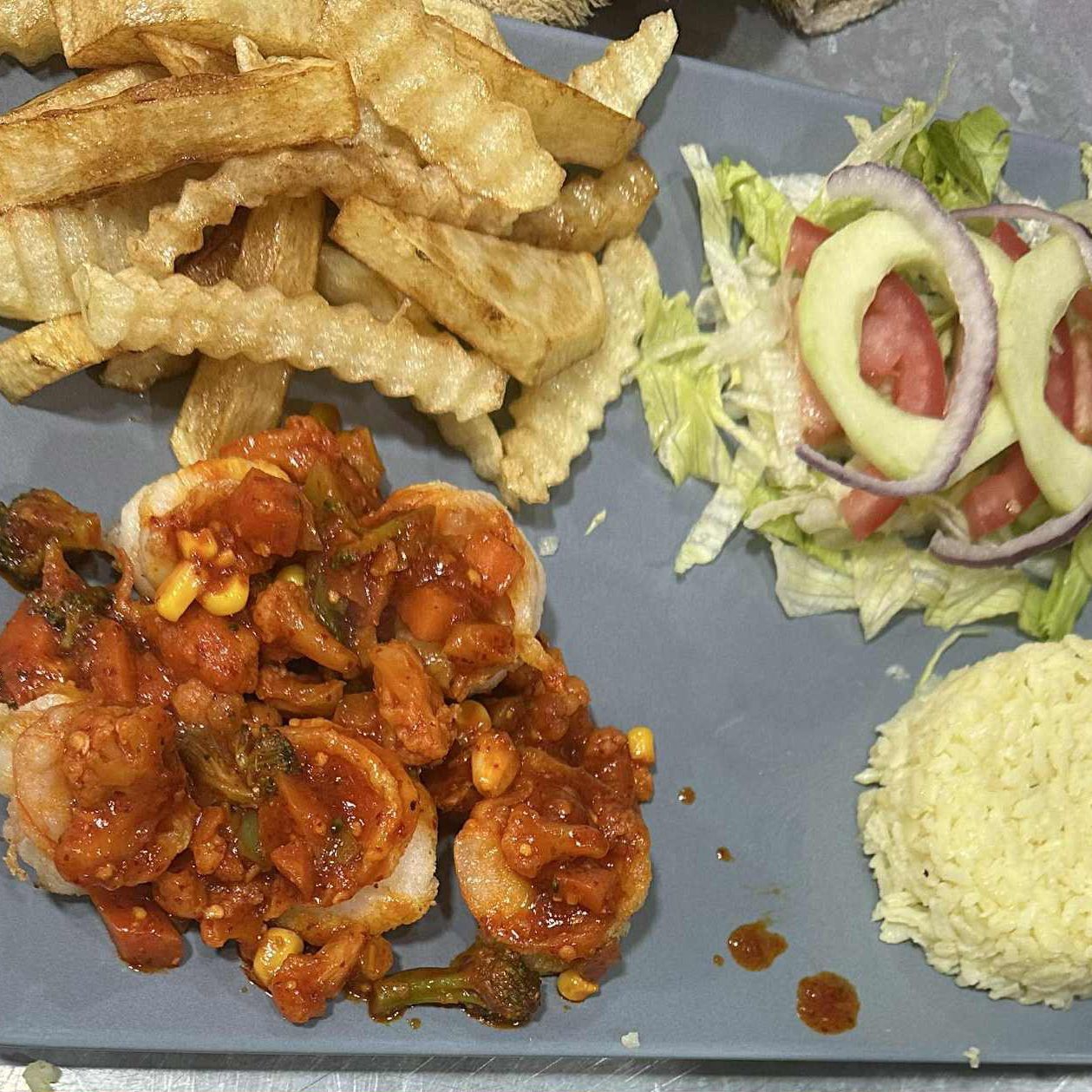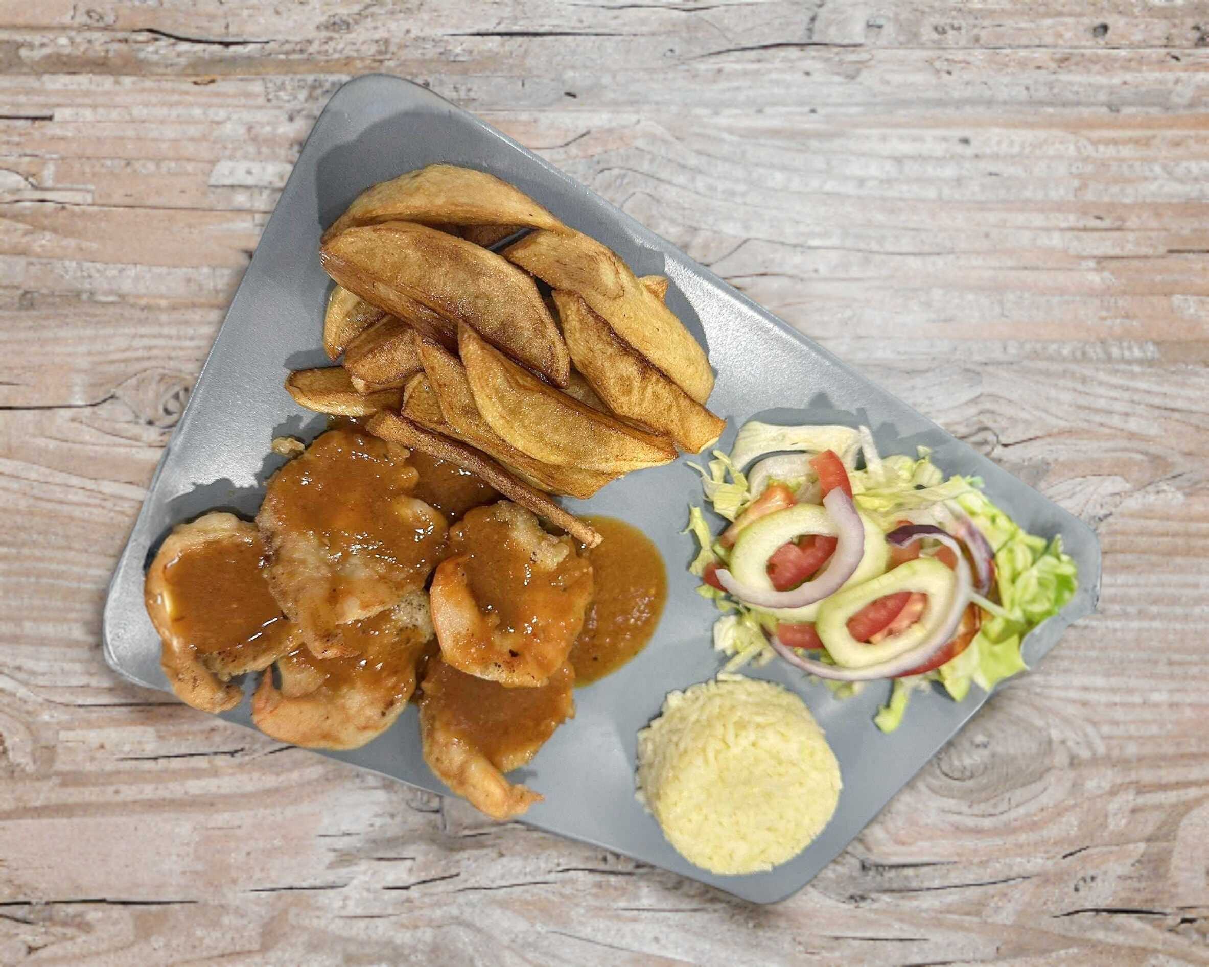 Camarón bañado en salsa habanero, arroz,papas, ensalada,pan