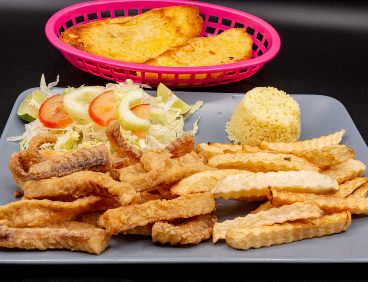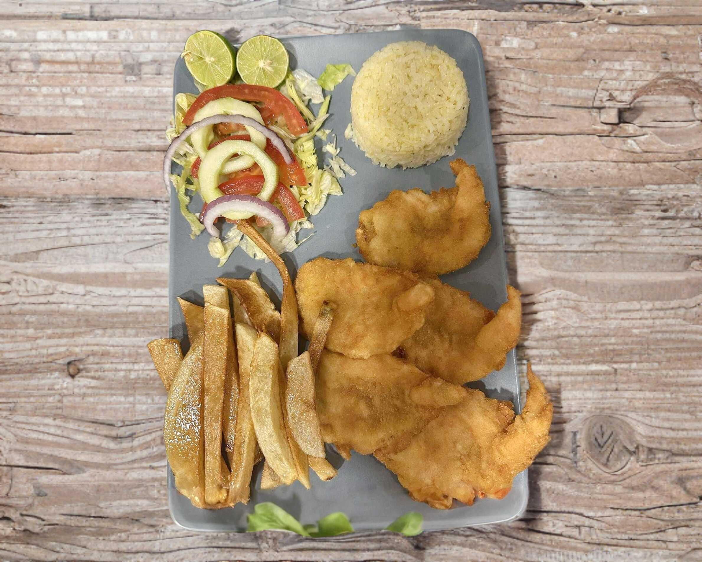 Camarón Empanizado, ensalada,arroz,papas,pan