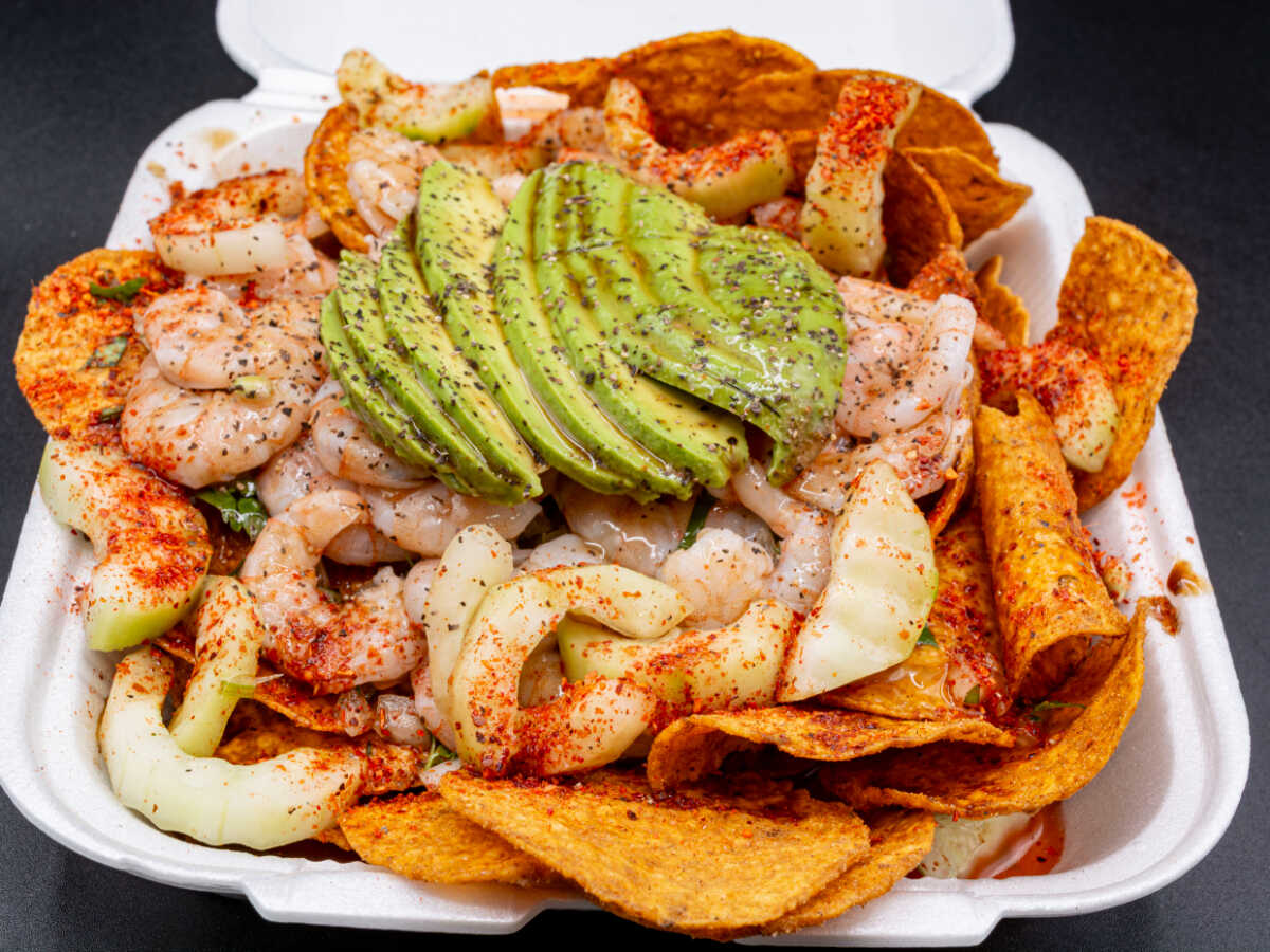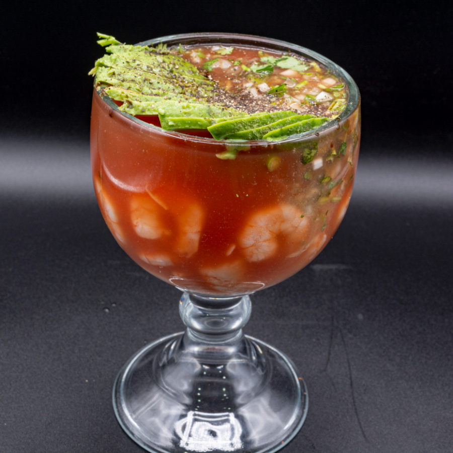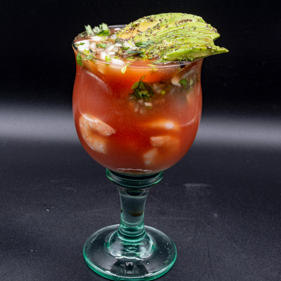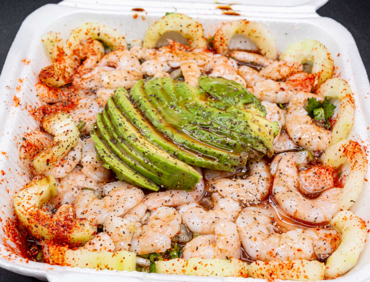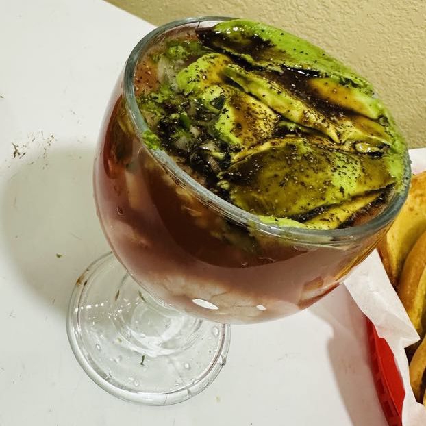Camarón, verdura,pepino.sal, pimienta, soya, catsup aguacate, limón, tostadas, galletas