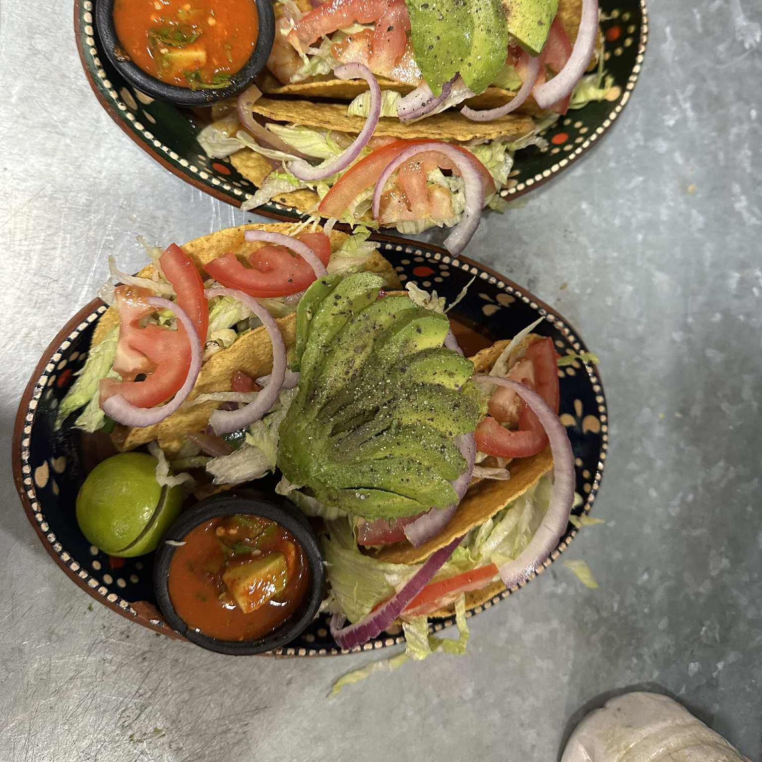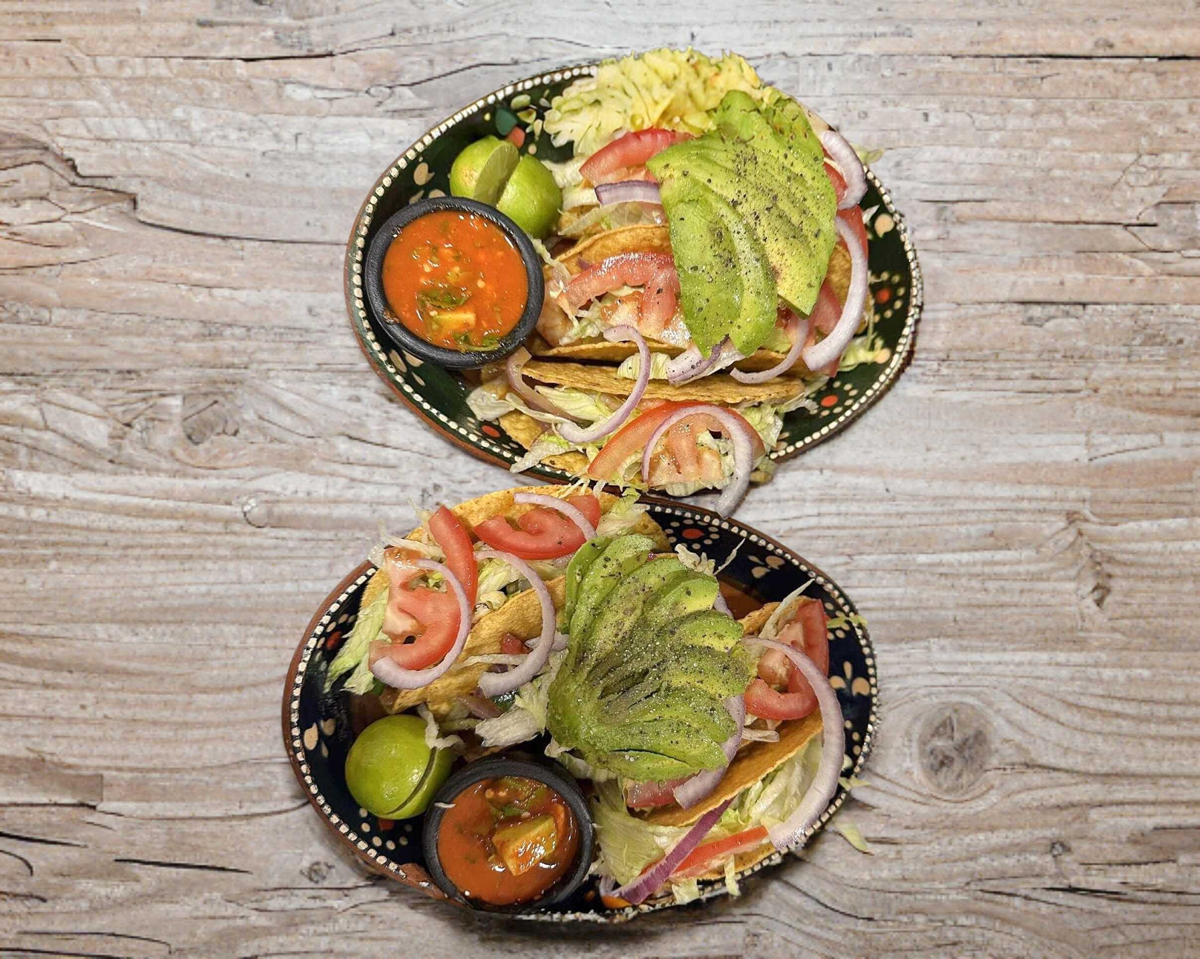 Tacos de Camarón, con chile,tomate, cebolla, lechuga aguacate salsa aparte y limón