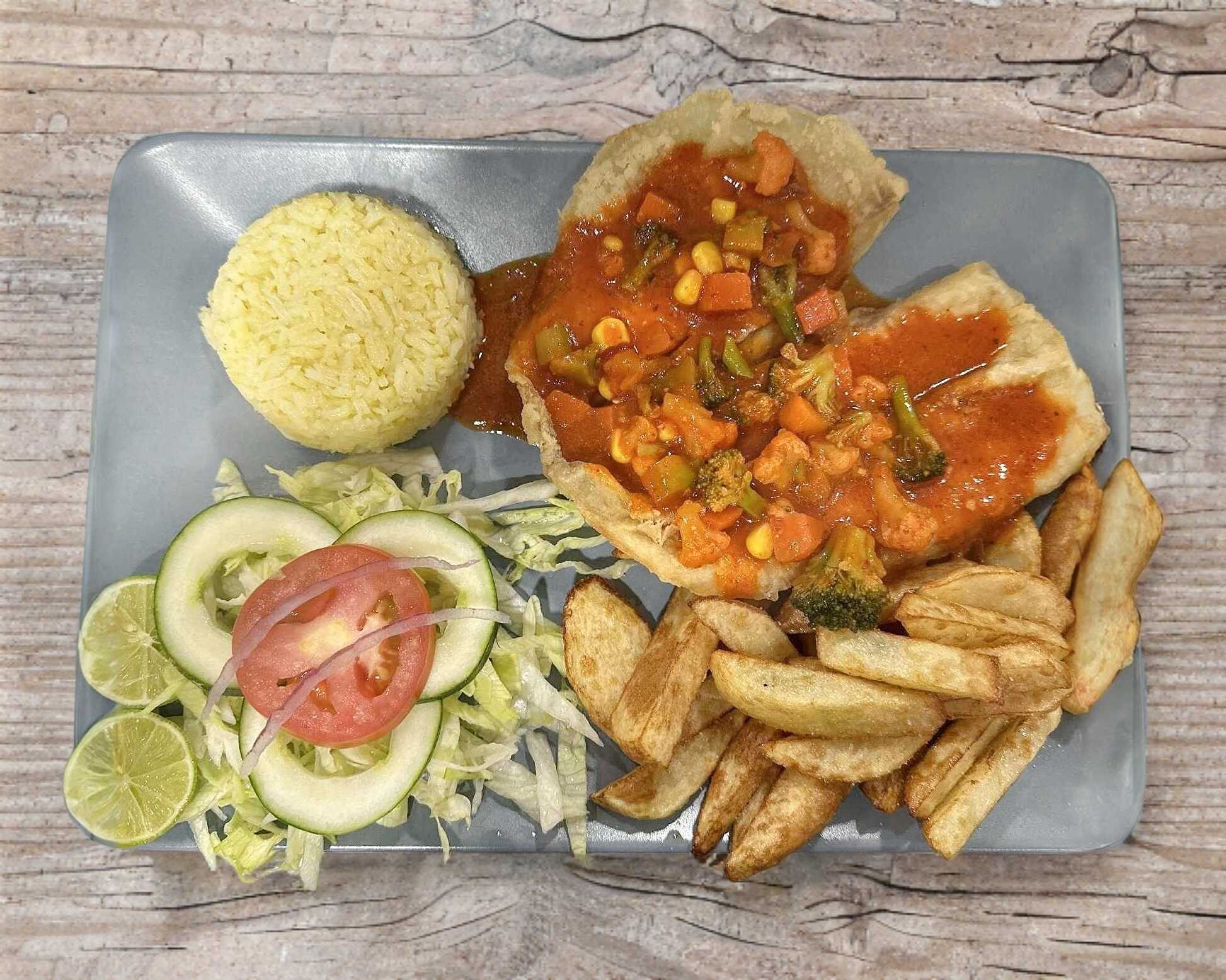 Arroz,papas, ensalada,pan