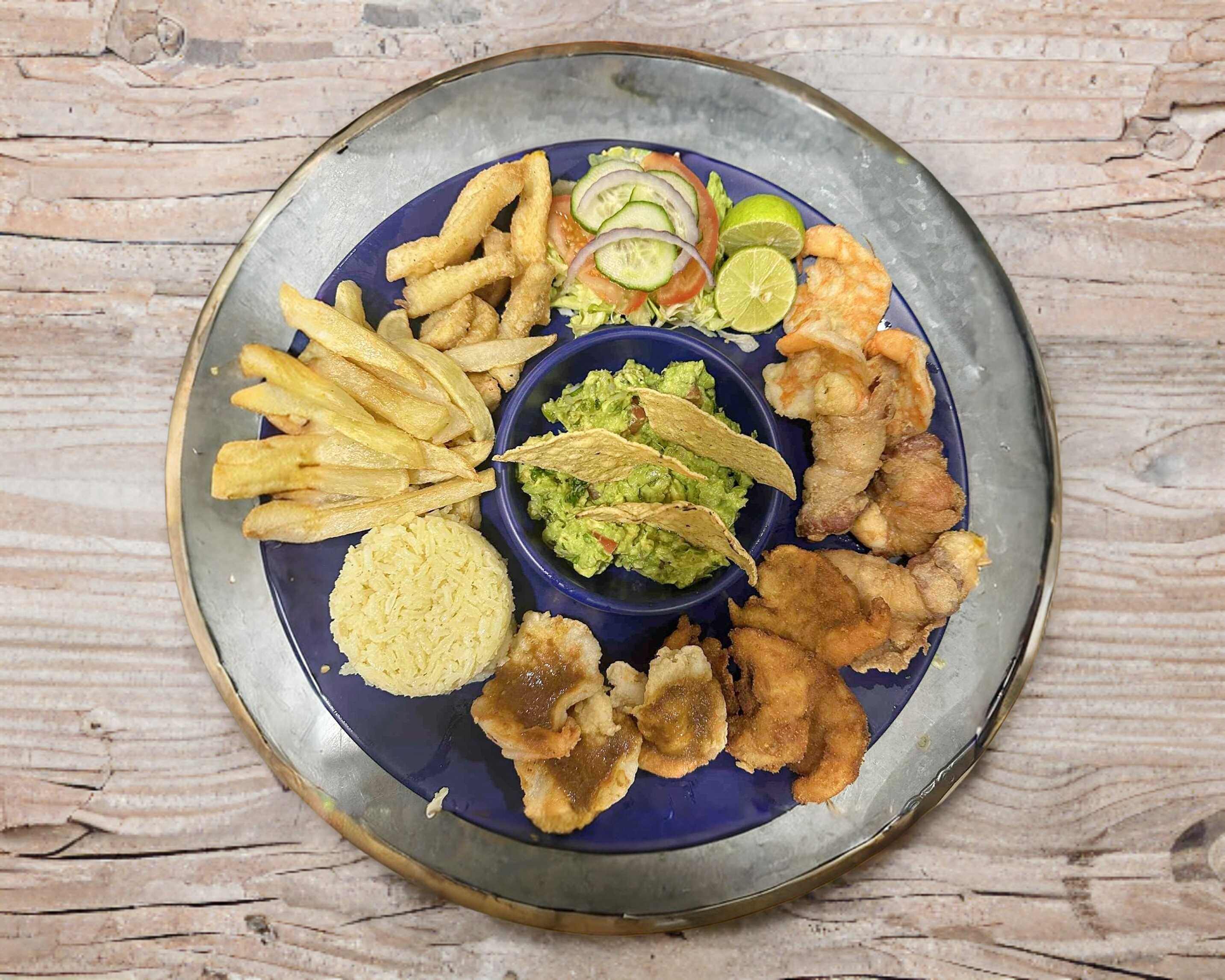 camarones, Empanizados, A la Diabla, a la mantequilla, Fiesta, Fajitas de pescado, arroz, guacamole, papas, ensalada, pan, salsas aparte