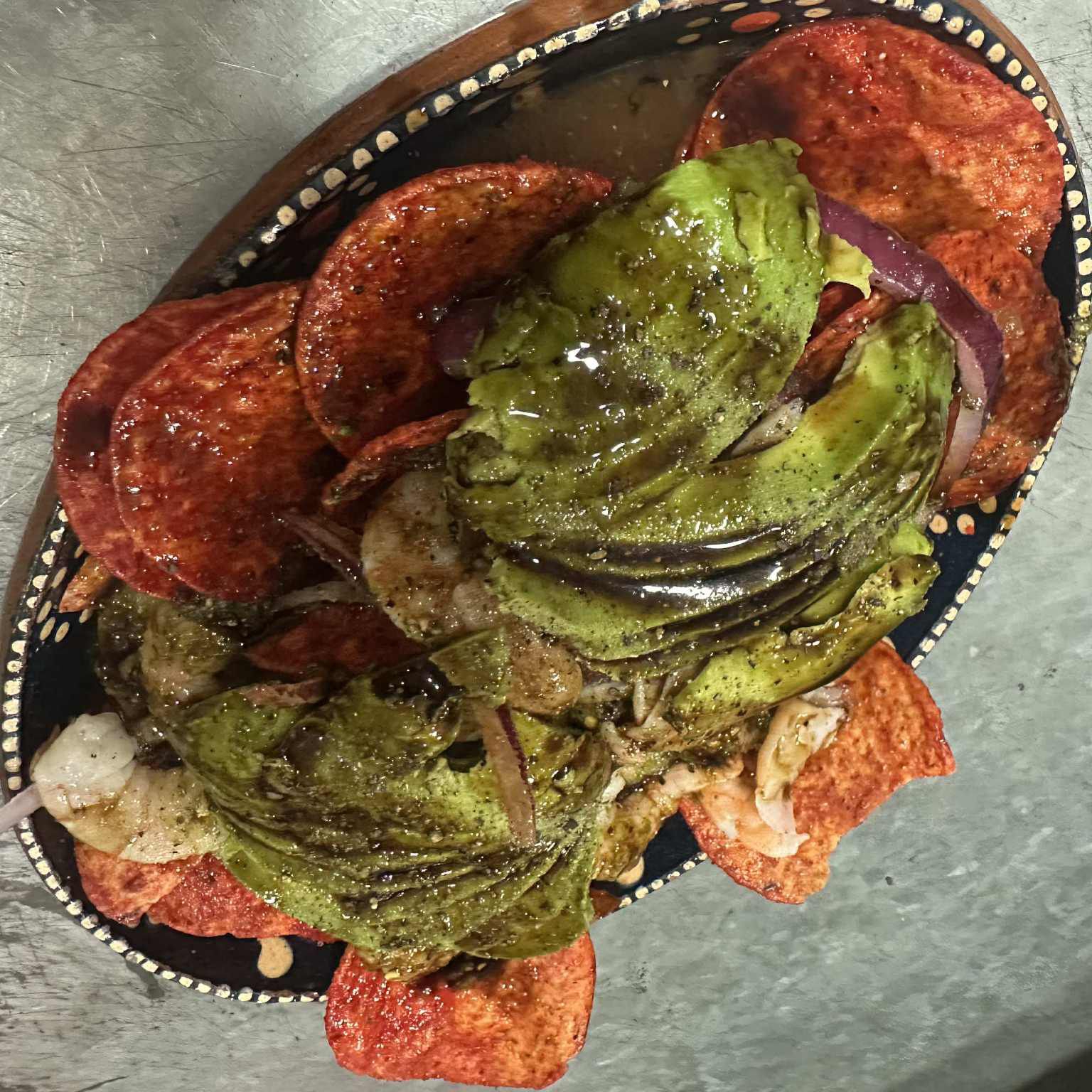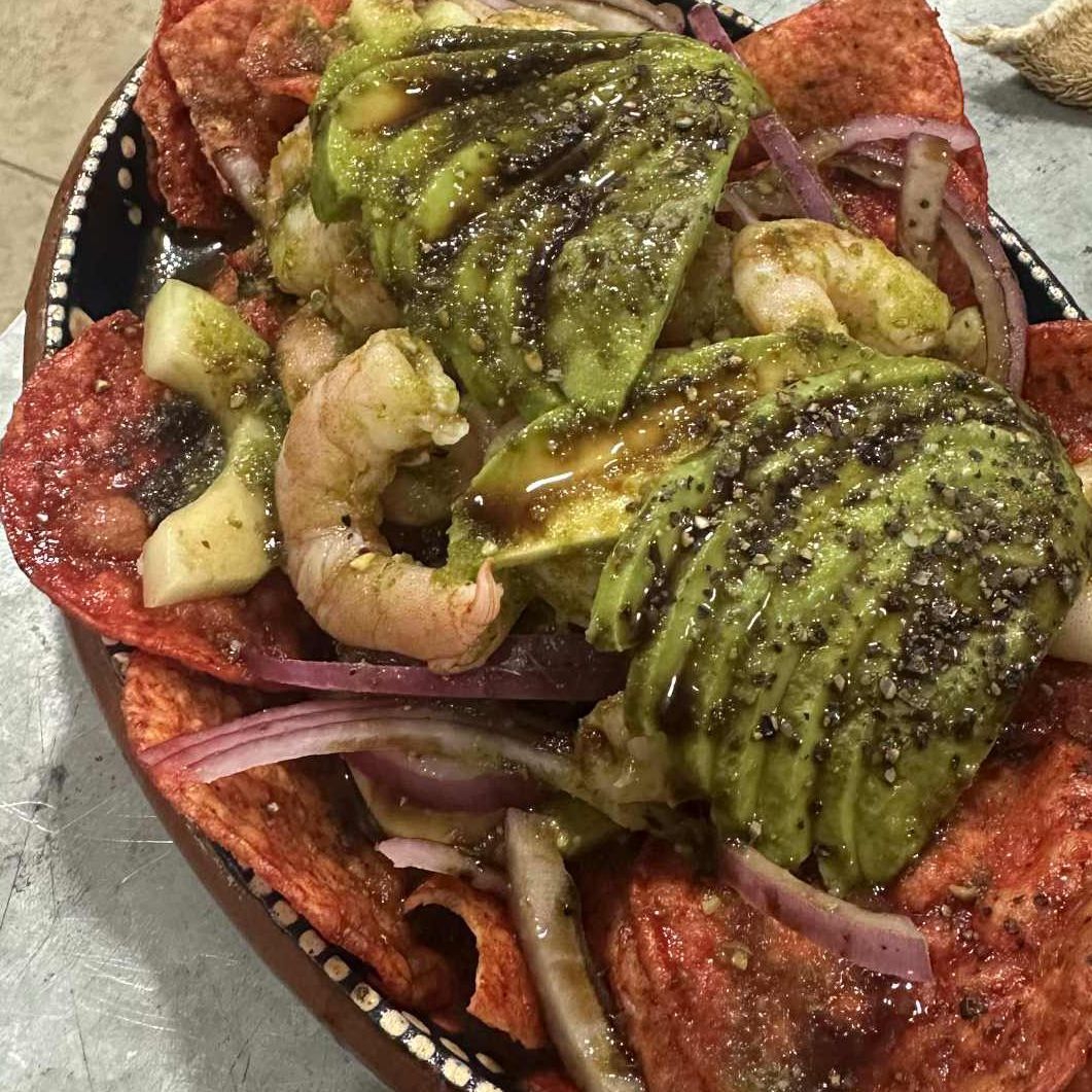 Camarón, pepino, cebolla morada, aguacate,soya,sal, pimienta, limón,salsa verde, tostadas