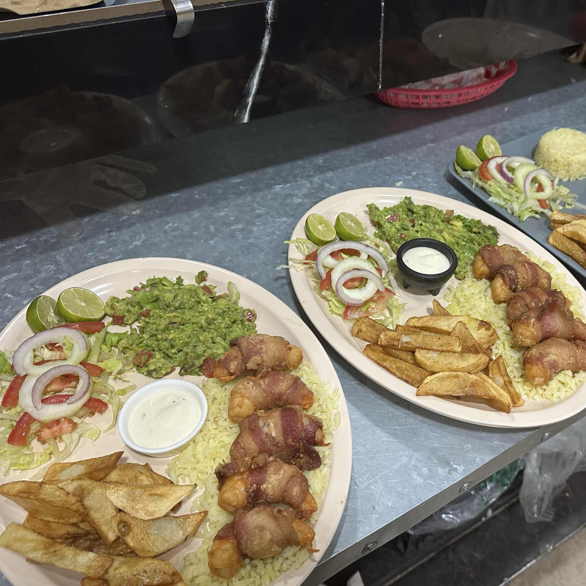 Camarón Envuelto en Tocino, guacamole,,papas,ensalada,aderezo,pan