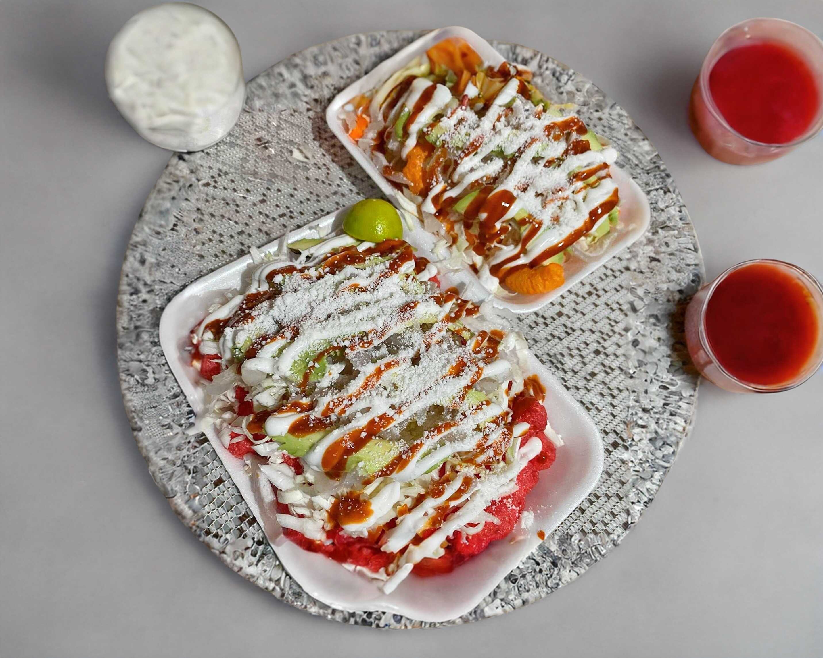Chicharrones repollo cueritos tomate aguuacate crema salsa y valentina