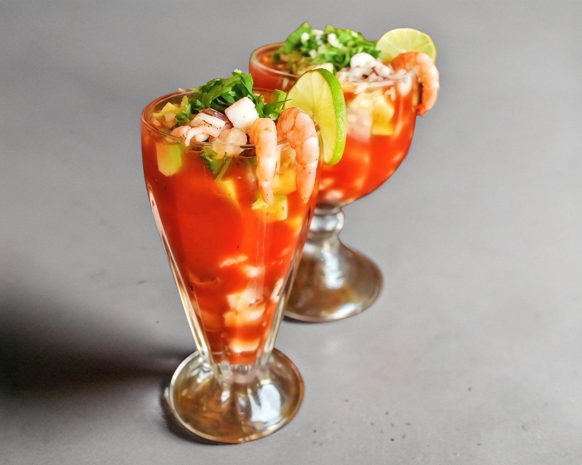 Orden Coctel de camaron cebolla apio tomate cilantro aguacate y salsa coctelera