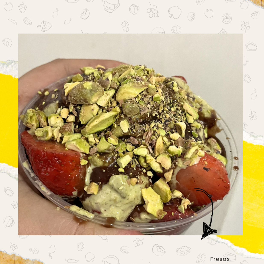 16 oz de Fresas frescas con chocolate y crema de pistache natural.