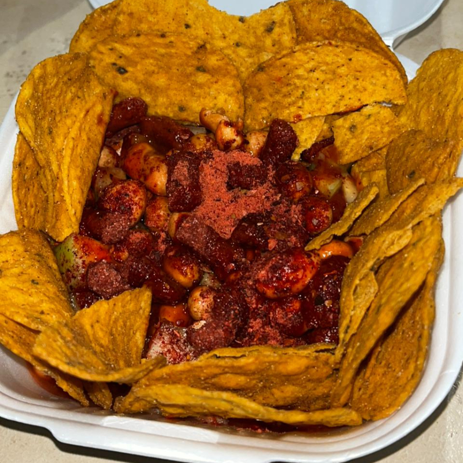 Tostitos locos preparados con: pepino, jícama, cacahuates, cueritos, chile en polvo, tajín, churro loco (tamarindo), limón, salsa soya Maggie, chamoy, salsa Valentina.