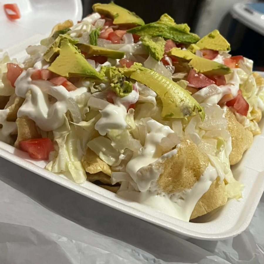 Tostitos Preparados con: Cueritos, repollo, tomate, crema, aguacate, salsa roja.