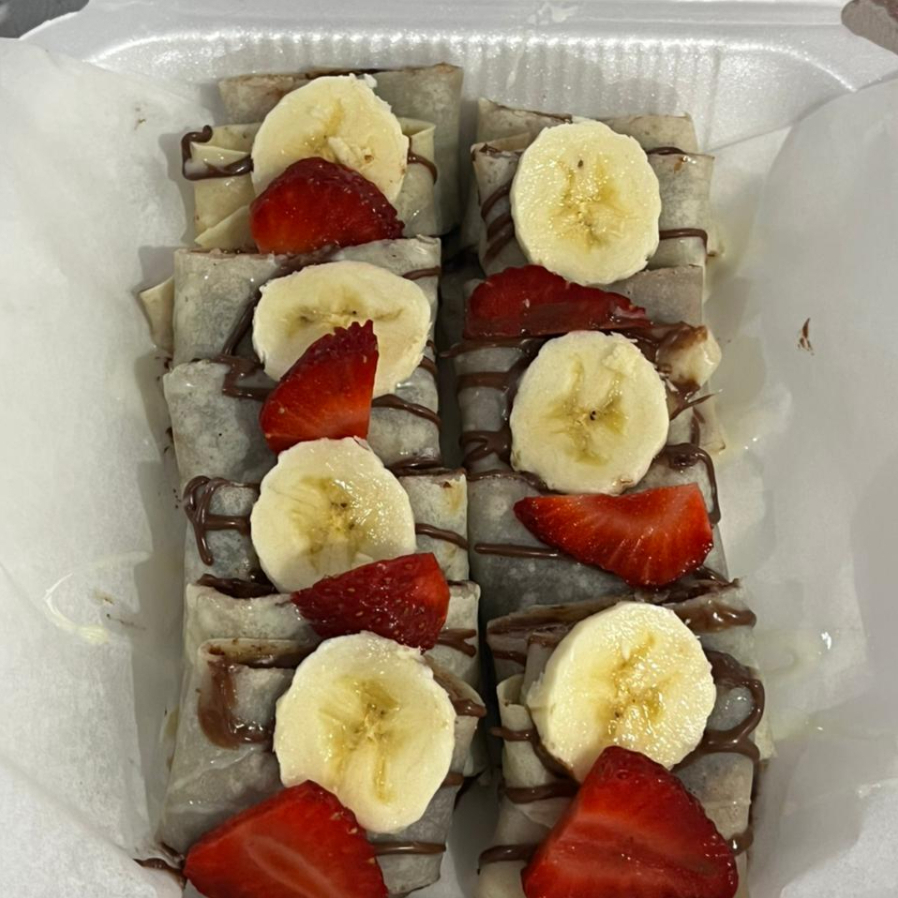 Rollitos de Crepa con NUTELLA plátano y fresa Topping a elección: Nuez, Almendra, galleta de chocolate.