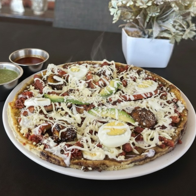 Base de frijoles refritos, queso de hebra, plataitos fritos, crema, huevo cocido y la carne de su eleccion