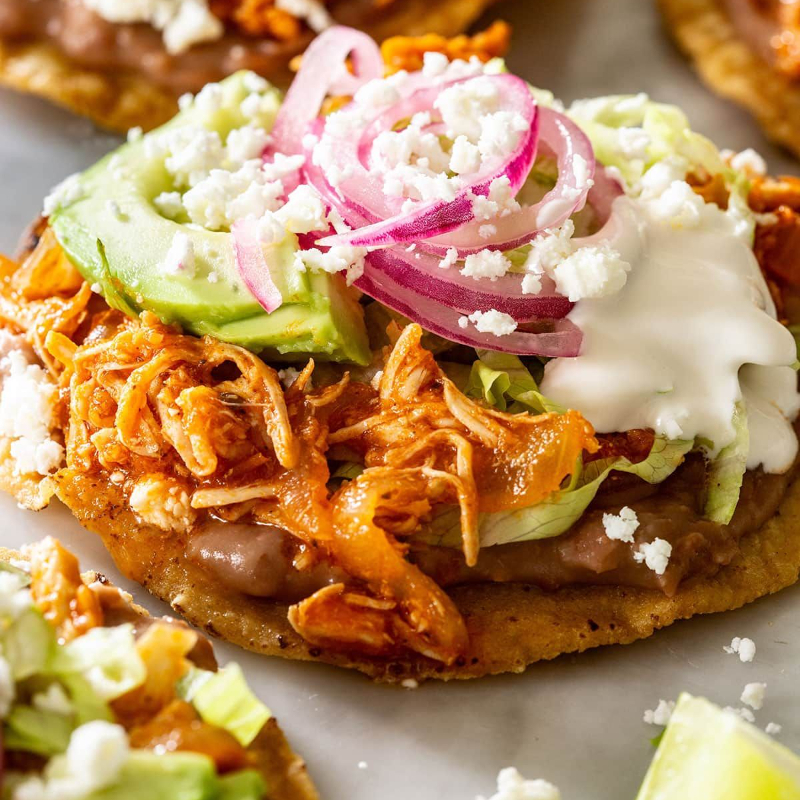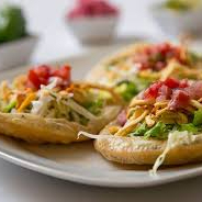 Ricas tostadas de pollo, molida o cochinita, acompañadas de lechuga, tomate, aguacate, crema y queso. 4 Piezas