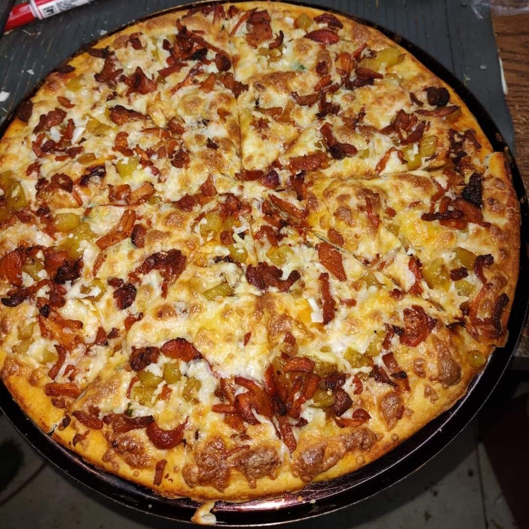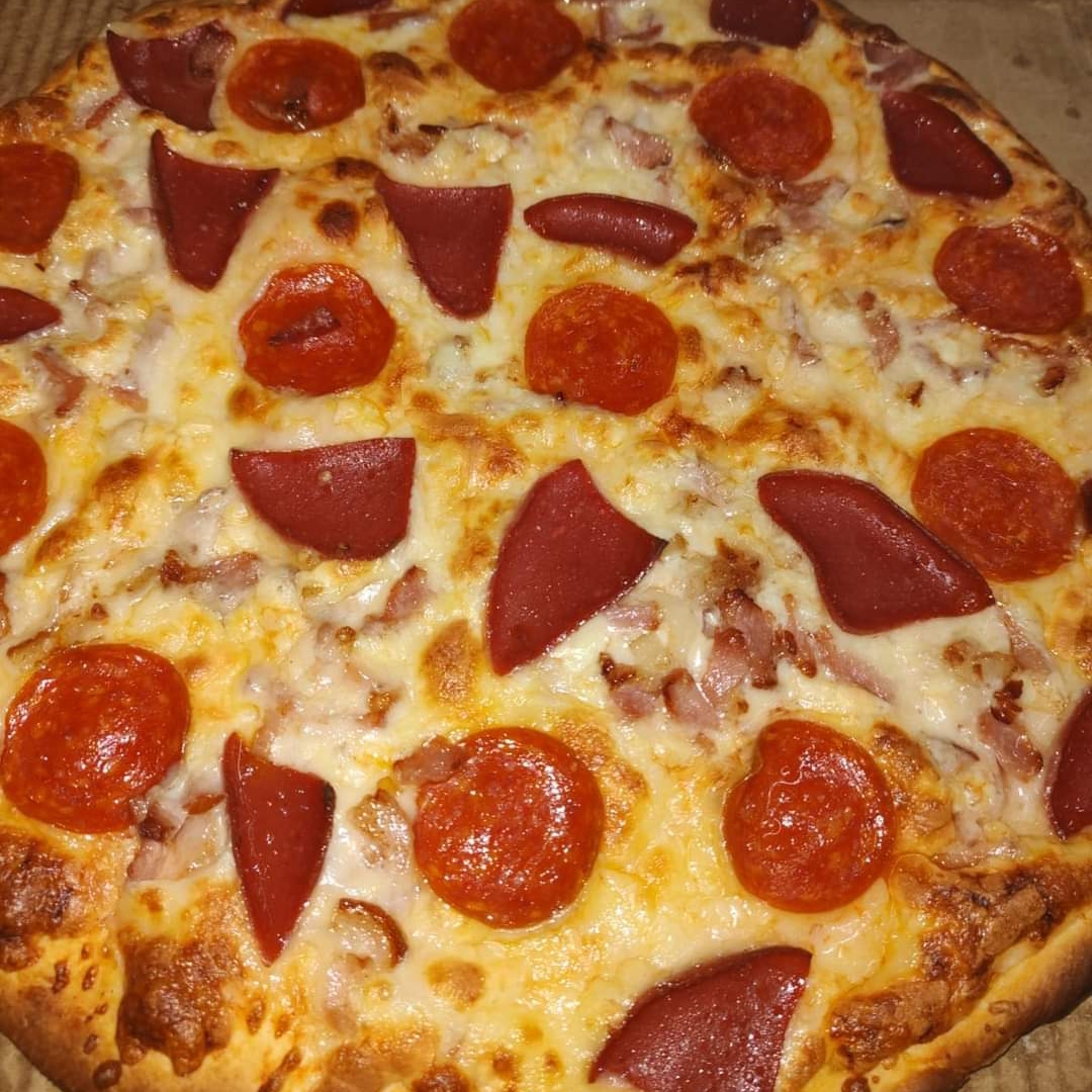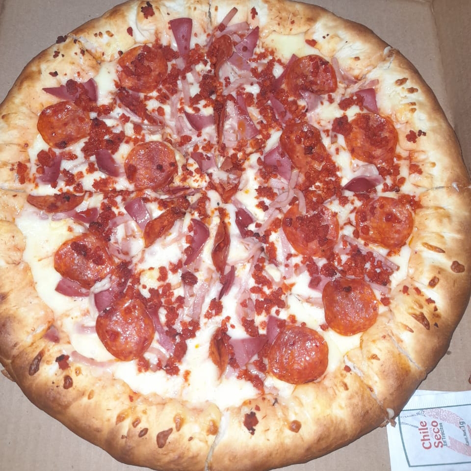 Pizza de 12 rebanadas. Peperoni, salami, tocino y chorizo