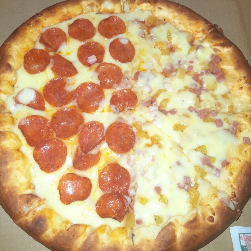 Pizza de 12 rebanadas mitad hawaiana mitad peperoni