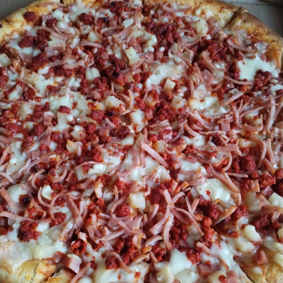 Pizza de 12 rebanadas. Piña, jamón, tocino y chorizo