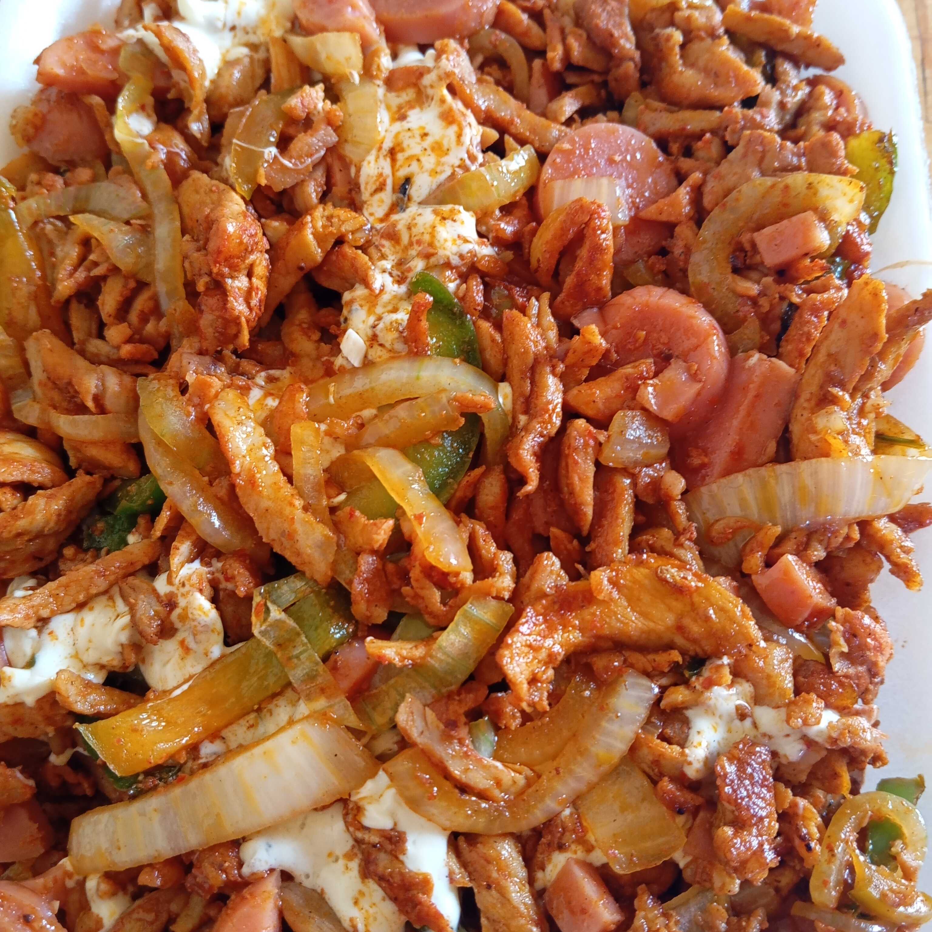Carne al pastor, cebolla, pimiento, jamón, Winnie y queso. Incluye tortillas,salsa, verdura y limones