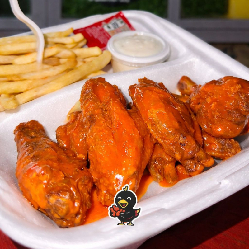 alitas 300gr fritas con 150gr de papas aderezo y catsup
