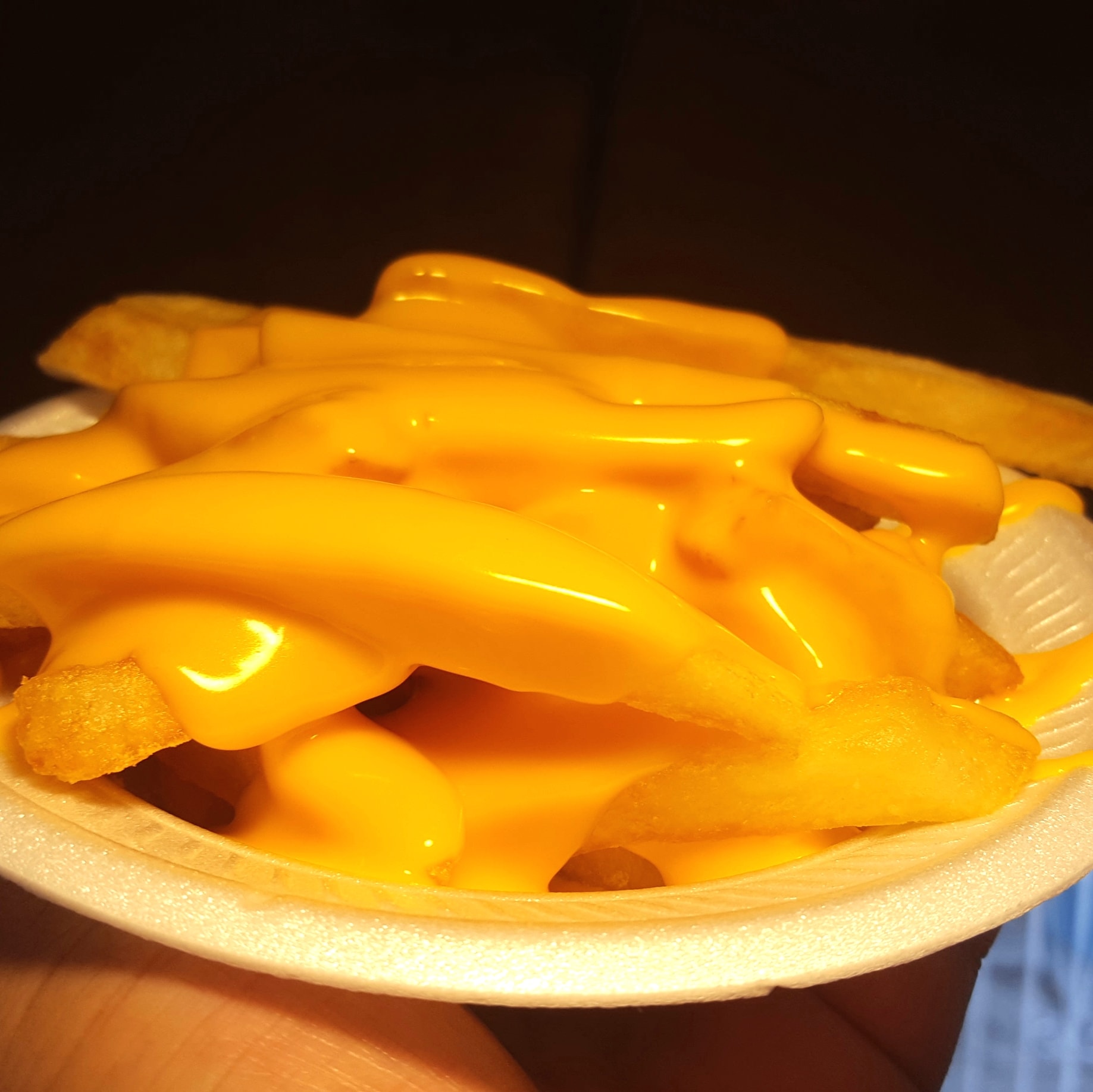 Papas fritas naturales cortadas sazonadas al momento, bañadas de queso cheddar derretido
