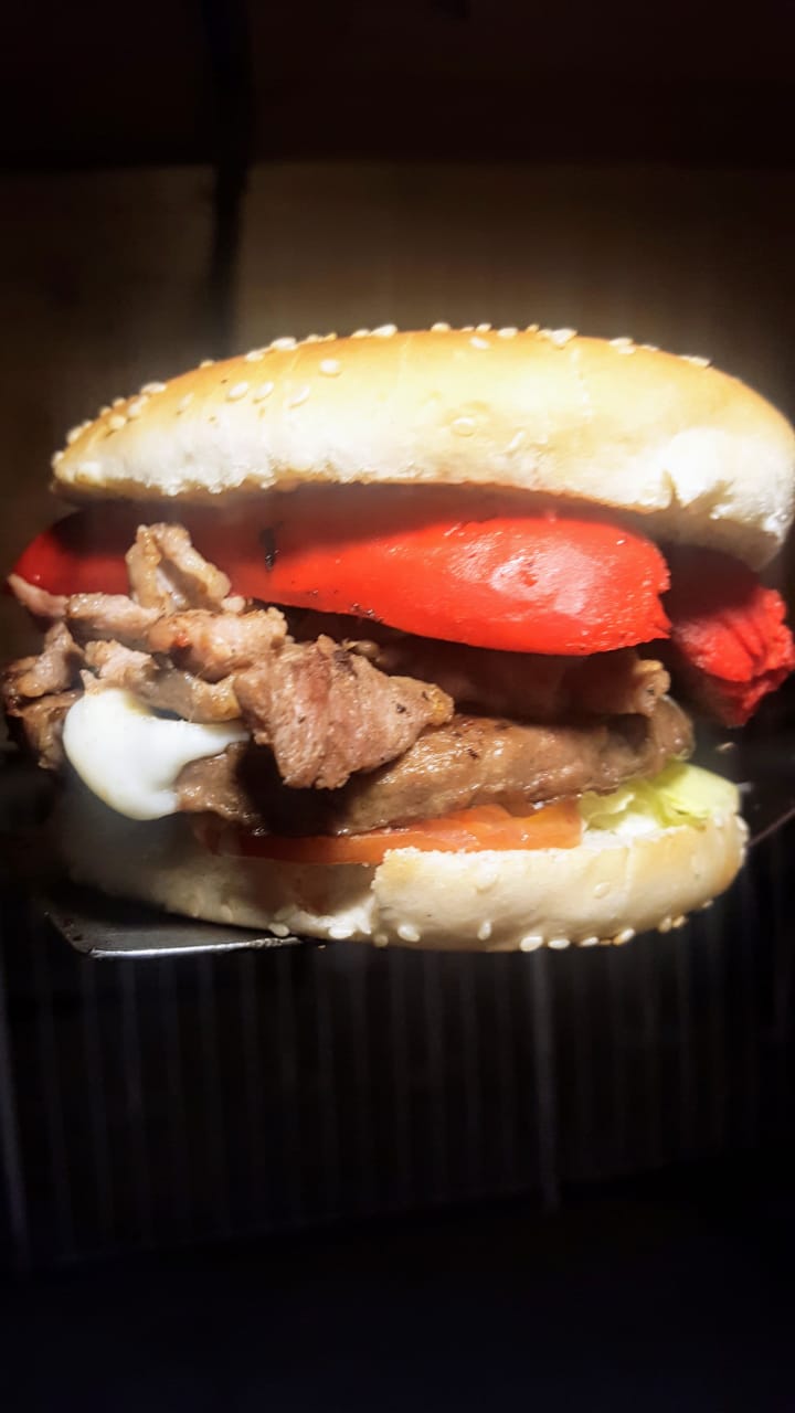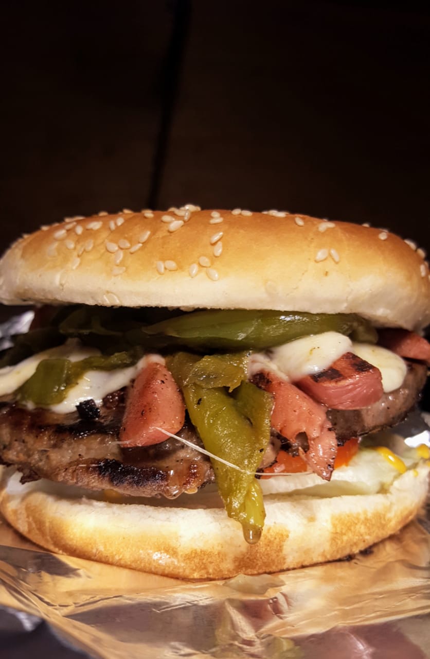 Carne 100% sirloing, queso asadero de villa ahumada, bistec, salchicha para asar, lechuga, tomate, pepinillos, mostaza, mayonesa y catsup