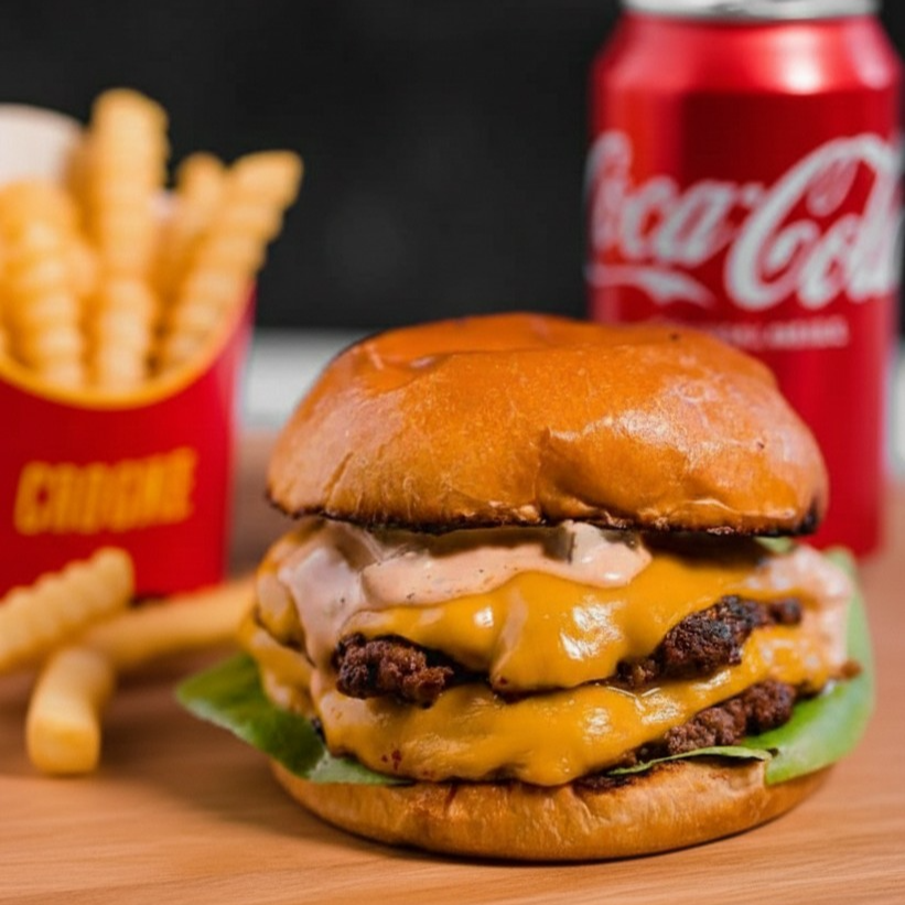 Pan Brioche con dos carnes de 150 gramos, doble queso amarillo, lechuga romana, pepinillos y aderezo clasico