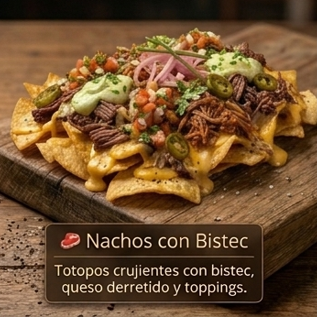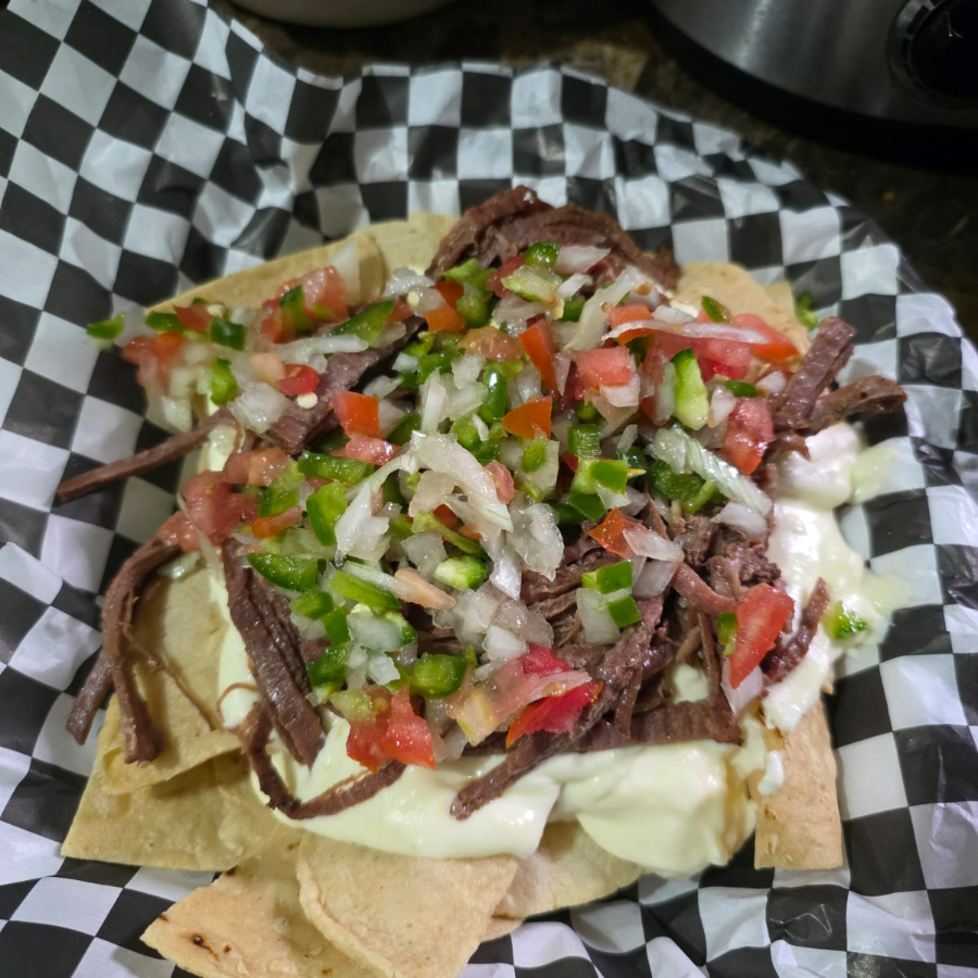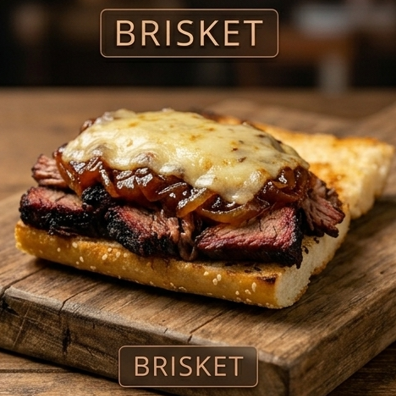 Brisket suave y jugoso, cocción lenta, con queso fundido y cebolla caramelizada.