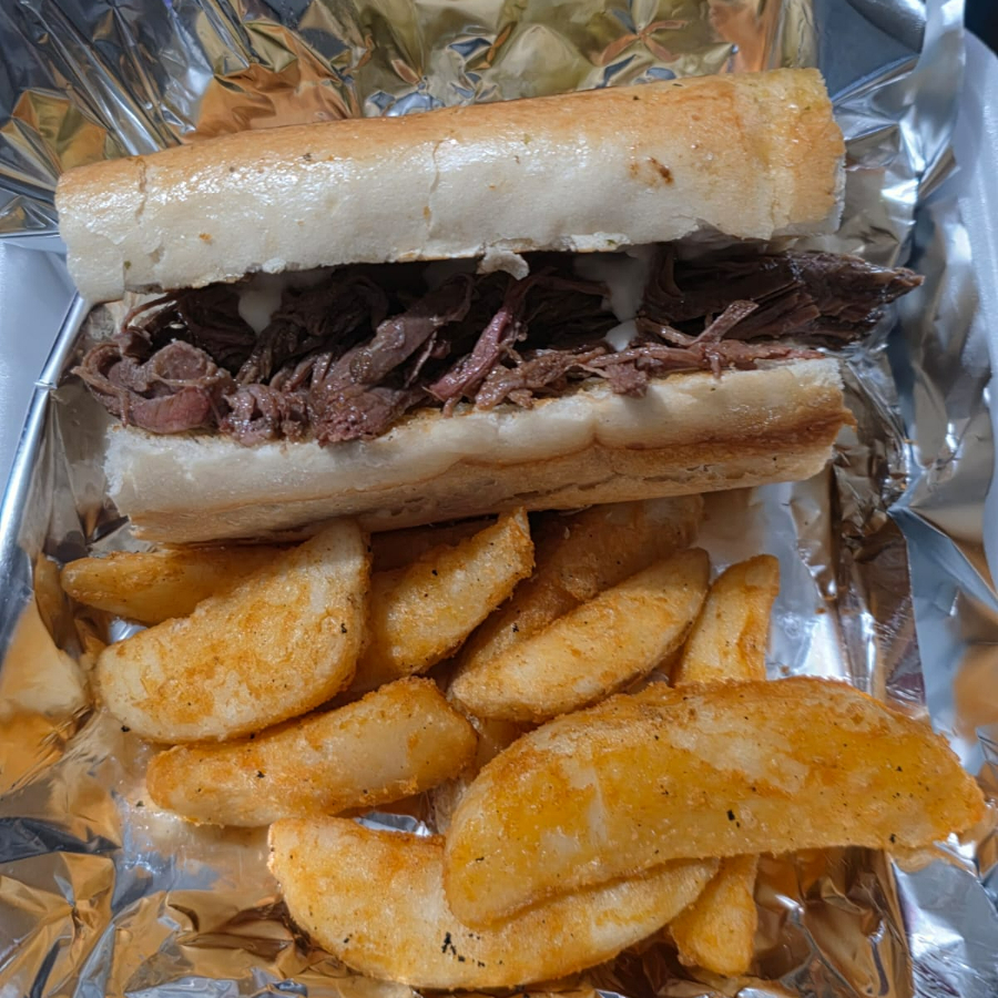 Tu cheesesteak favorito acompañado de papas crujientes y bebida.