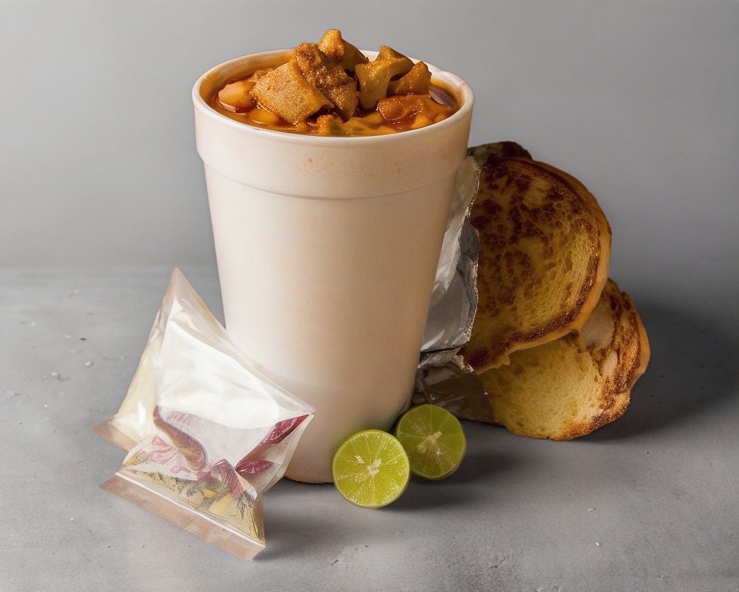 ½ litro de menudo recién hecho, incluye cebolla, orégano, limón, chile quebrado y 1 pan a la plancha.