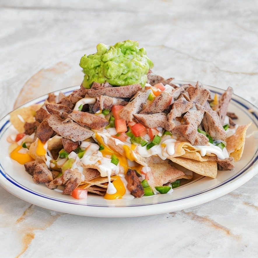 TOTOPOS GRATINADOS CON QUESO DE LA CASA, CREMA DE FRIJOL TOQUE DE CHIPOTLE, GUACAMOLE, PICO DE GALLO, ZIGZAG DE QUESO AMARILLO Y CREMA CON SIRLOIN AL GRILL (250 g) FAJEADA ENCIMA