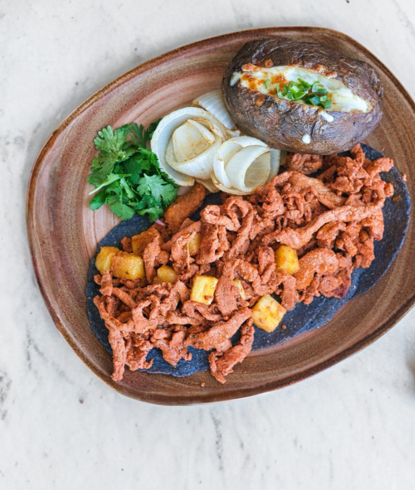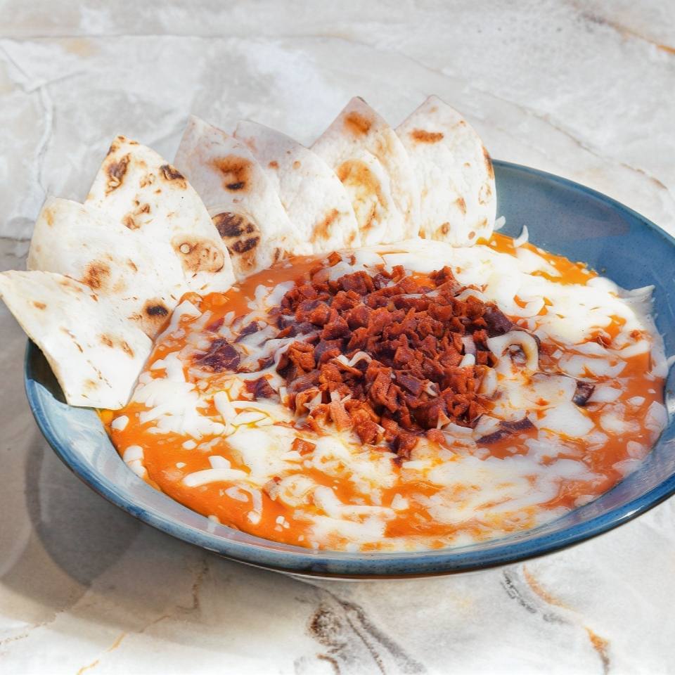 TOTOPOS BAÑADOS EN TU SALSA FAVORITA CON BIRRIA (100 G), ACOMPAÑADOS DE FRIJOLITOS REFRITOS.
