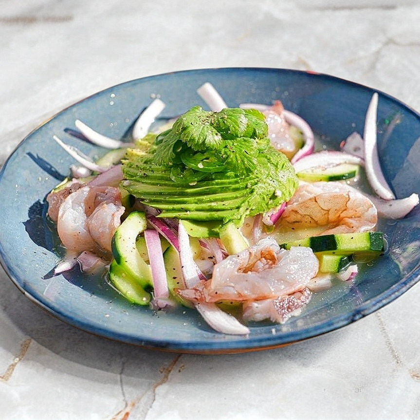 CAMARONES VERDES O ROJOS COCIDOS EN LIMON CON AGUACATE, PEPINO Y CEBOLLA MORADA.