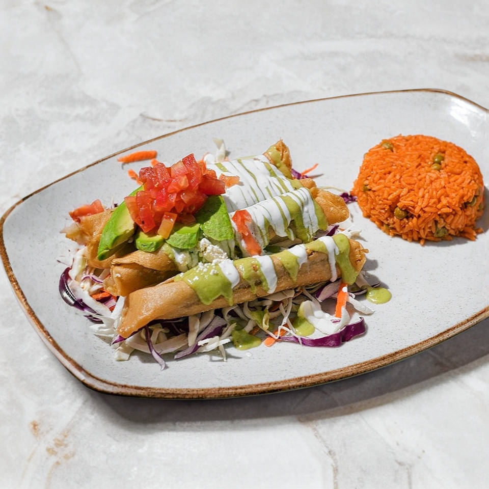 FLAUTAS DE DESHEBRADA CON SALSA DE GUACAMOLE, QUESO COTIJA, CREMA, AGUACATE Y TOMATE PICADO, ACOMPAÑADAS DE ARROZ Y ENSALADA DE COL. 100% CARNE DESHEBRADA