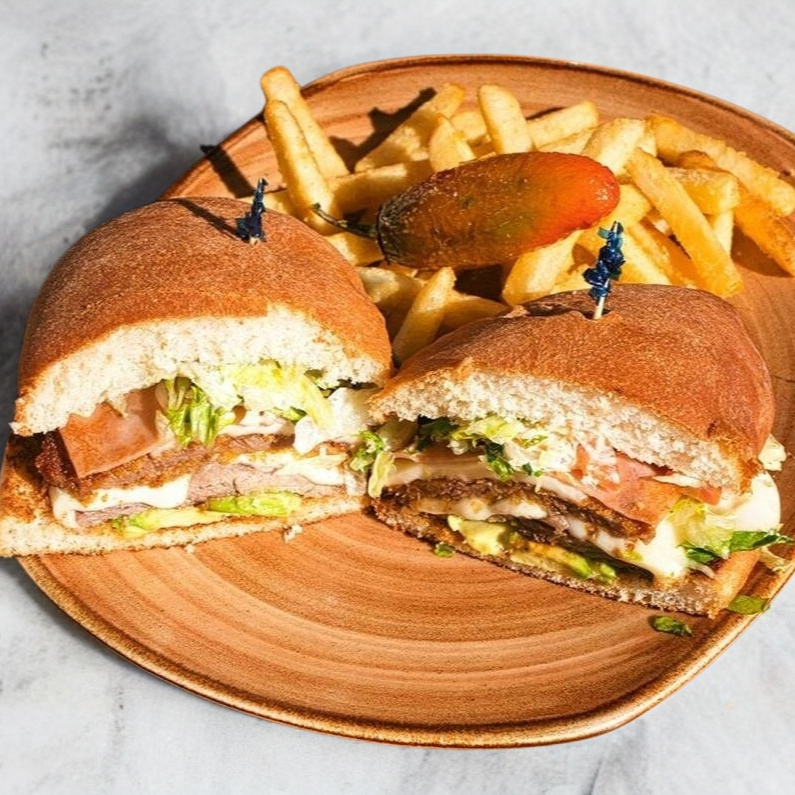 TORTA DE MILANESA Y SIRLOIN (200 g) CON JAMÓN, QUESO ASADERO, AGUACATE, ADEREZO DE LA CASA, LECHUGA, TOMATE ACOMPAÑADO DE PAPAS FRITAS Y UN CHILE TOREADO.
