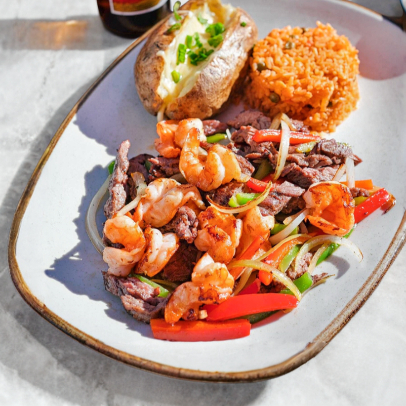 FAJITAS DE ARRACHERA (250 g) Y CAMARONES SALTEADOS (125 g) CHILE MORRÓN Y CEBOLLAS SALTEADAS, ACOMPAÑADAS DE PAPA ASADA Y ARROZ