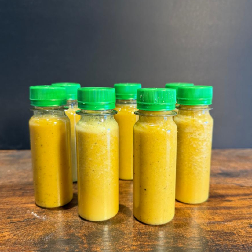 SHOT ANTIINFLAMATORIO Potente combinación natural para reducir la inflamación, fortalecer el sistema inmune y mejorar la diges ón. Con el poder del jengibre y la cúrcuma, ac vados con pimienta negra y equilibrados con cítricos frescos. Un shot diario para cuidar tu salud desde adentro.