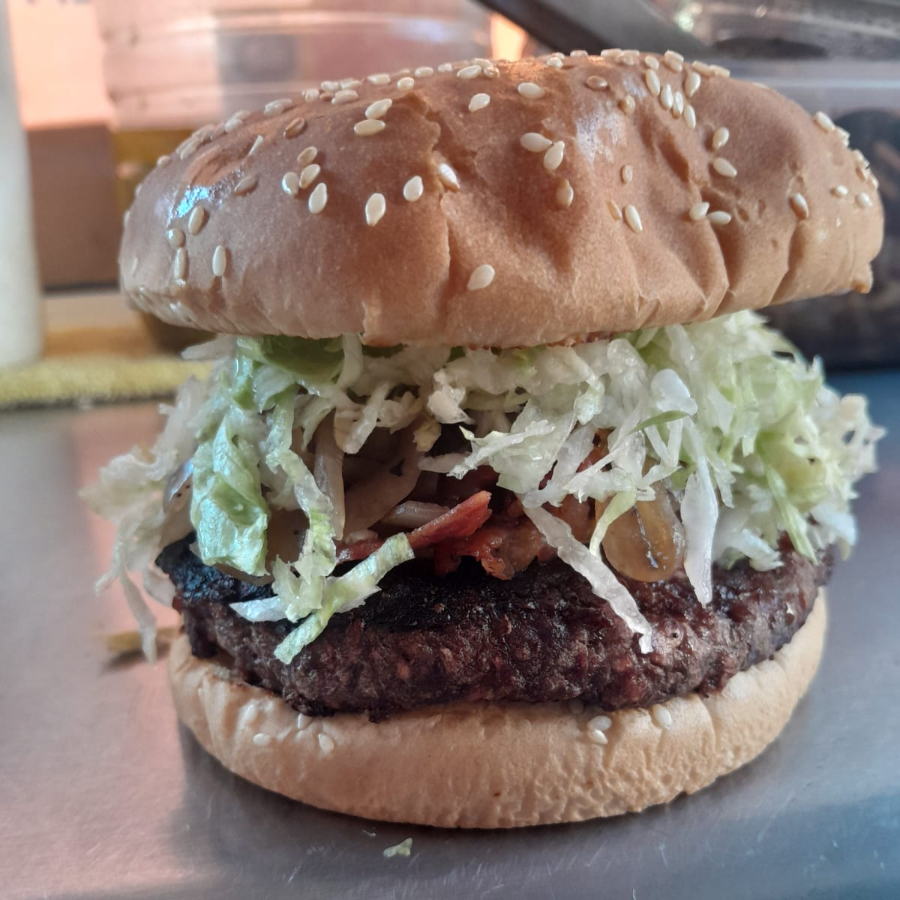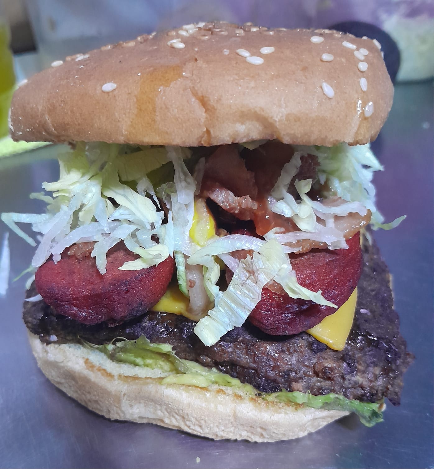 Carne res 1/2 Lb sabor habanero, Tocino, Queso, Cebollitas, Pepinillos y liquidos.