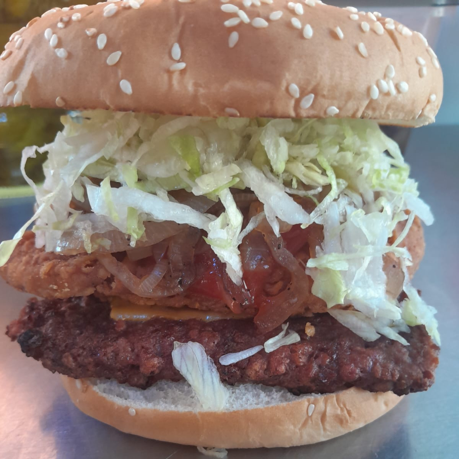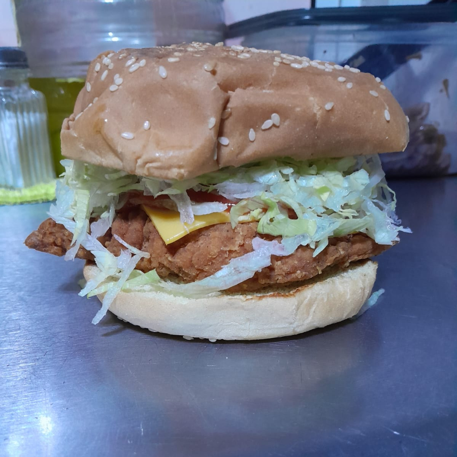 Pechuga empanizado, Queso, Lechuga, Pepinillos, Cebollitas y Liquidos.