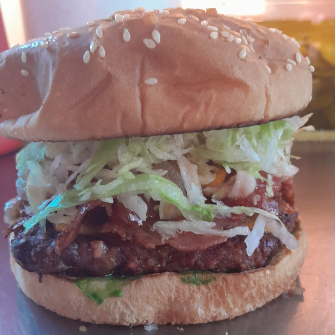 Carne, Queso, Tocino, Aguacate, Cebollitas, Pepinillos, Lechuga y Liquidos