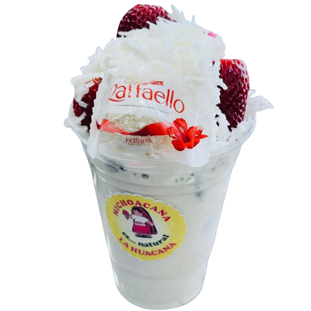 Fresas Naturales Frescas o Fresas Naturales Congeladas, Crema Batida, Crema especial receta de la casa, coco rallado, Chocolate Raffaello y 1 topping a elegir.