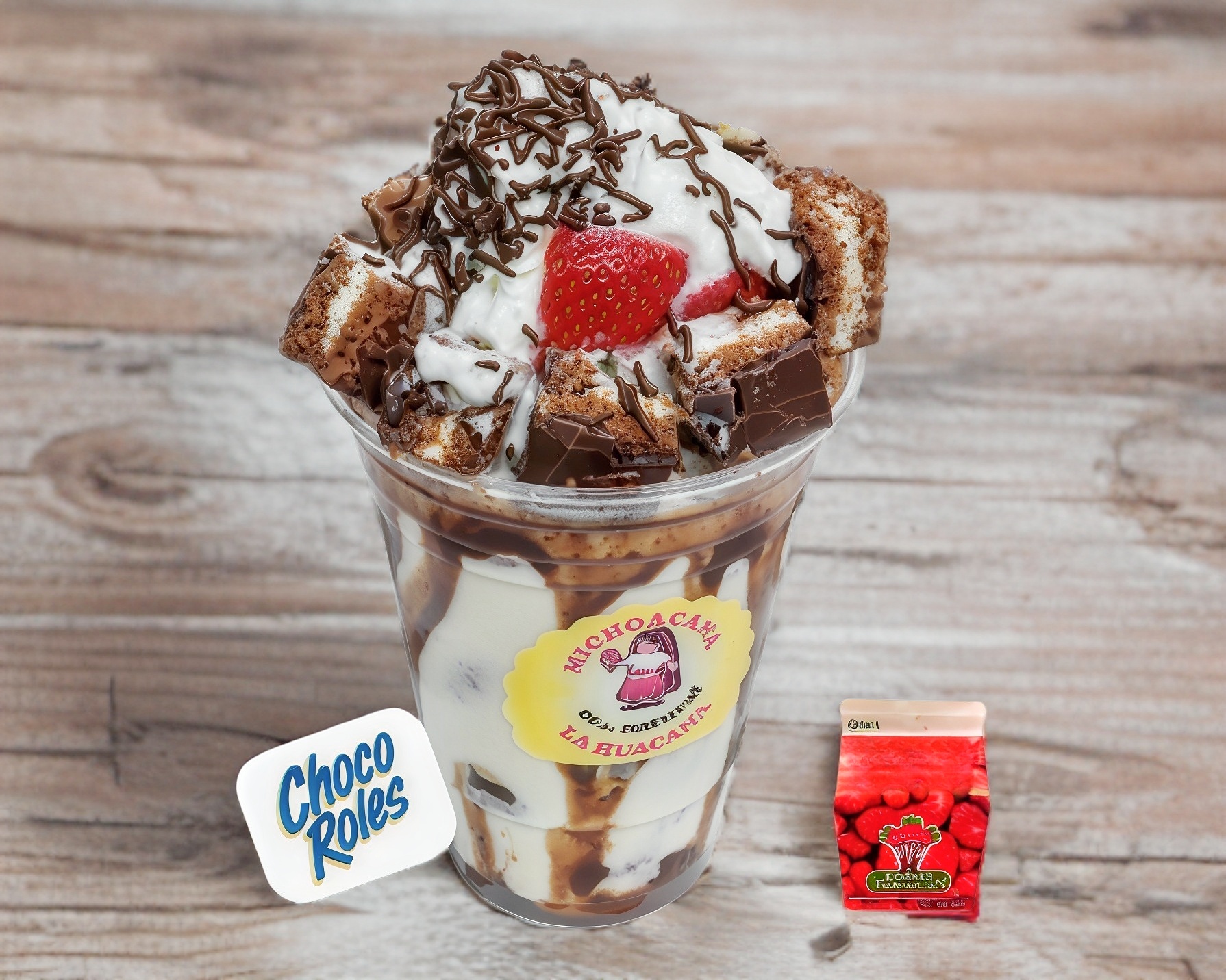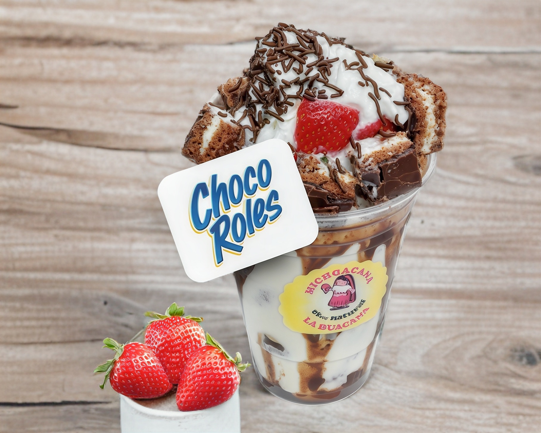 Chocolate Hershey's, Fresas Naturales Frescas, crema dulce receta de la casa, crema batida, pastelito ChocoRoles cortado en trocitos y 1 topping de tu elección.