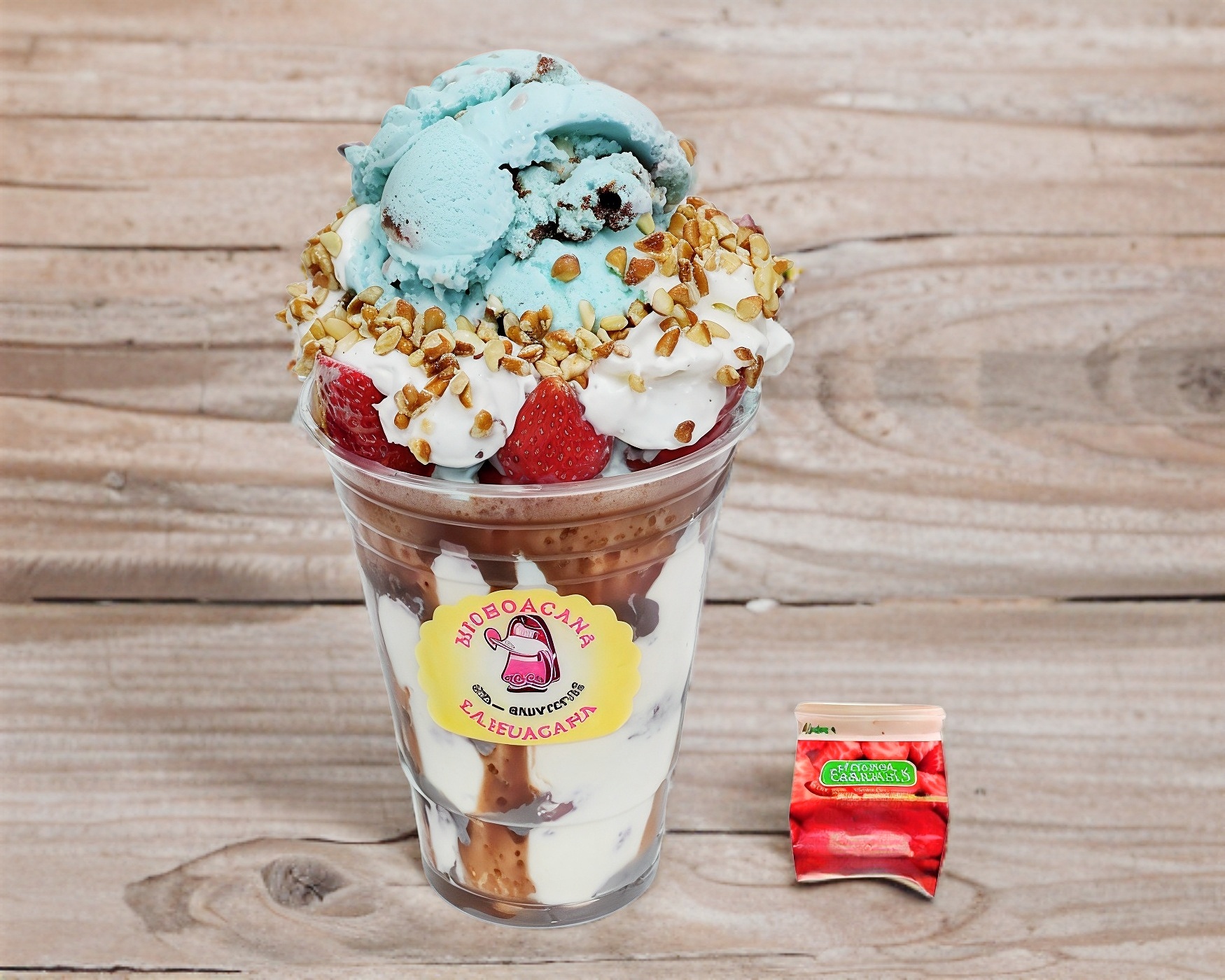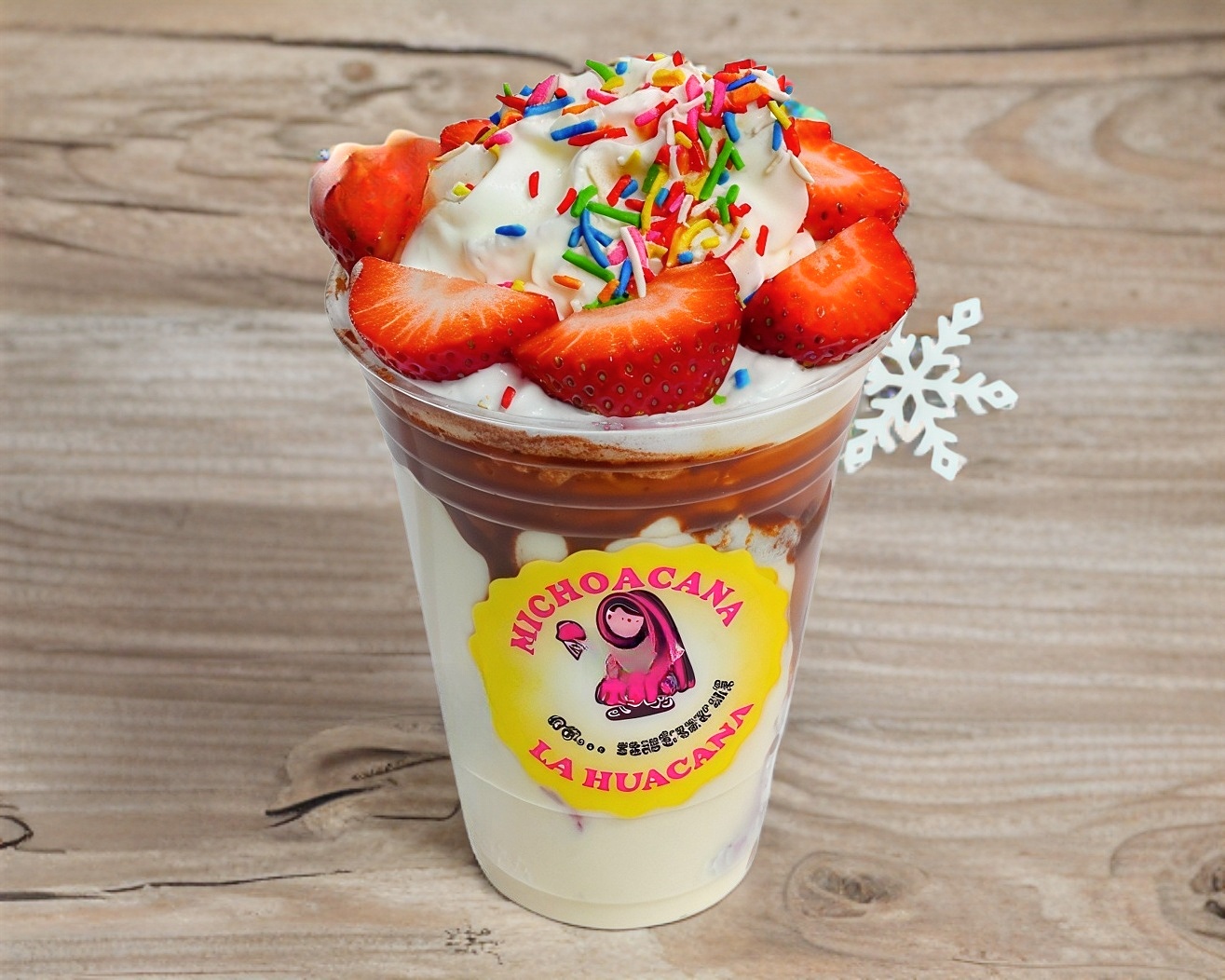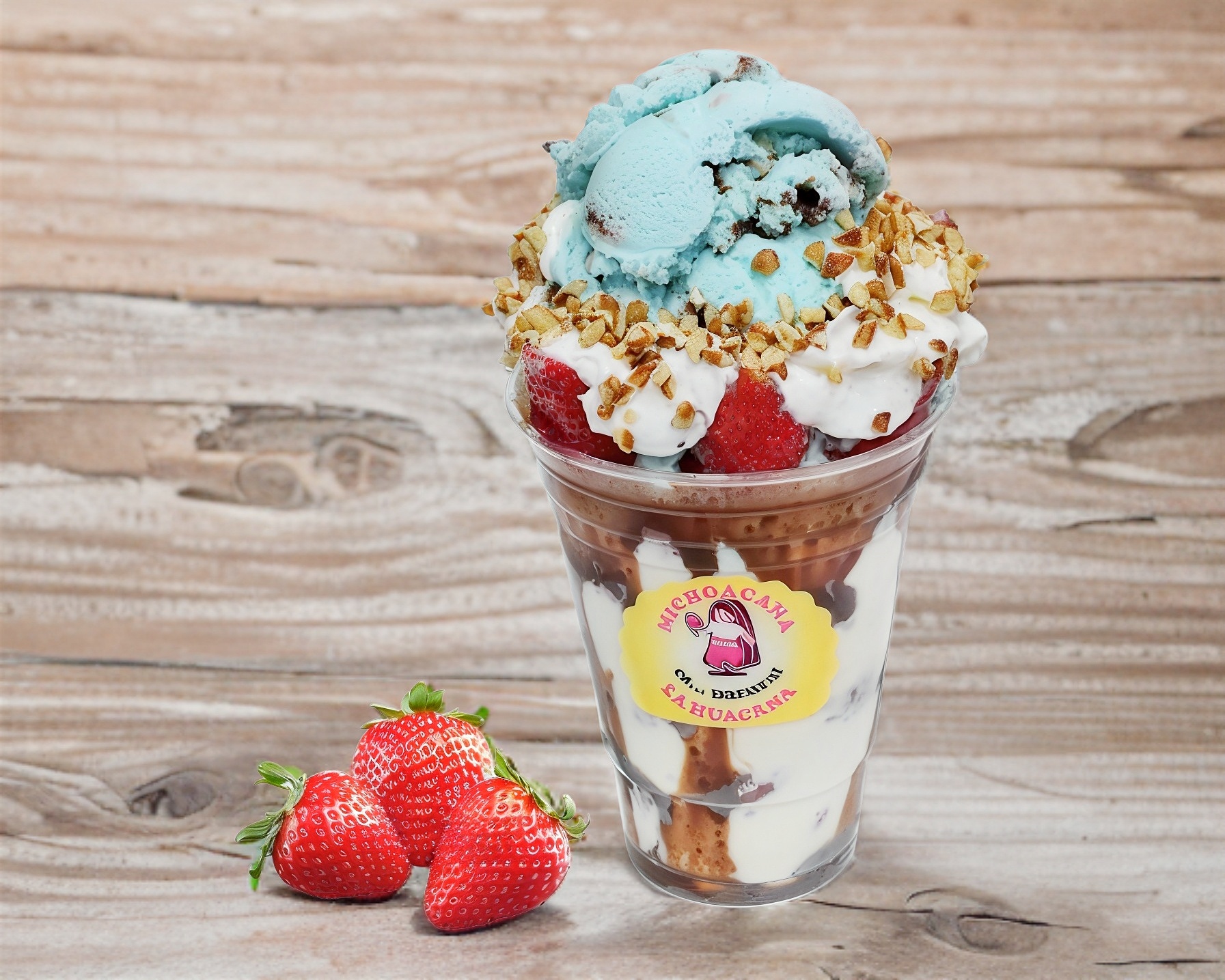Chocolate Hershey's, Fresas Congeladas de Cajita, crema dulce receta de la casa, crema batida, 1 topping de tu elección y una paleta de crema del sabor que elijas. (Estas fresas se sacan de la cajita y se preparan en un vaso.)