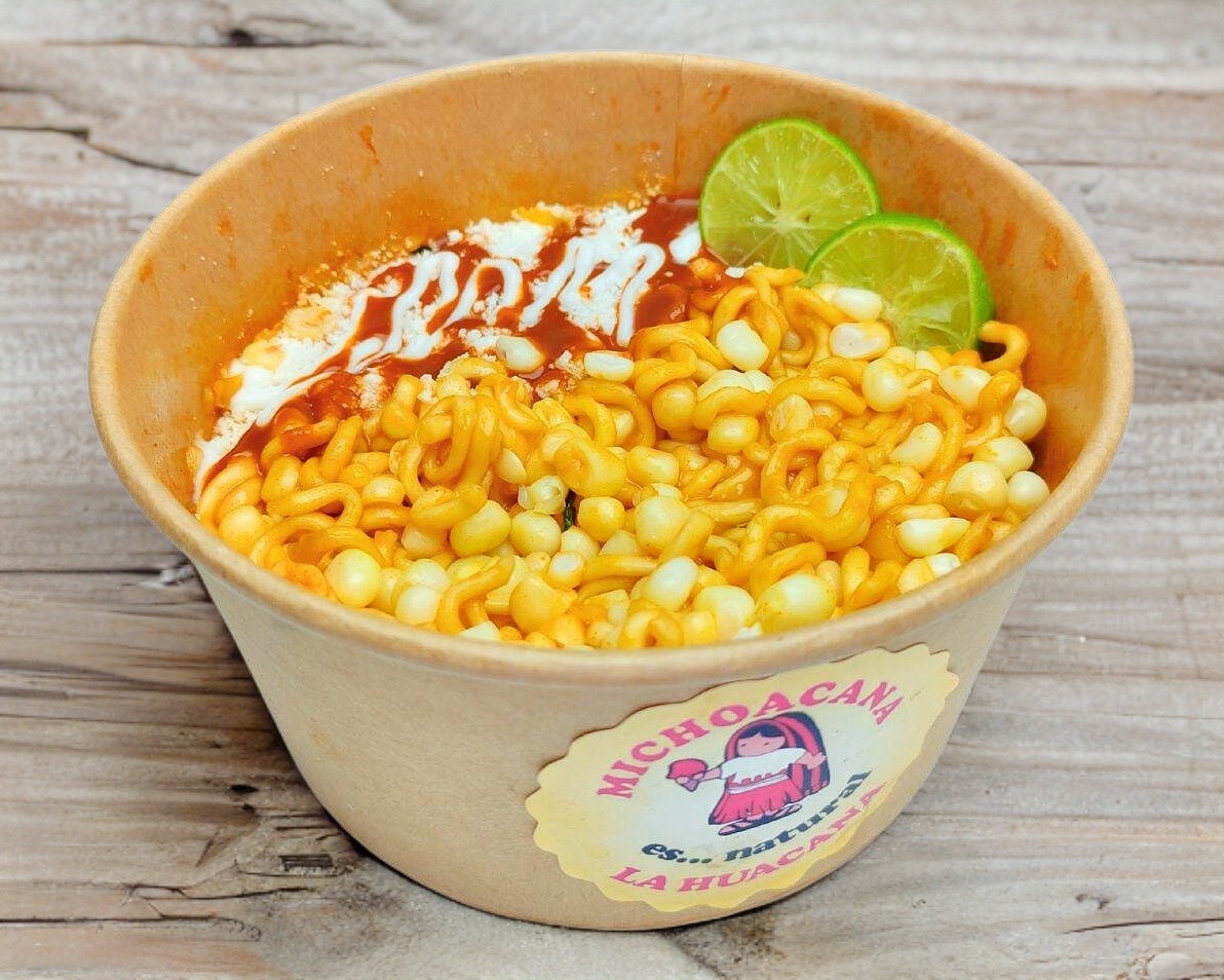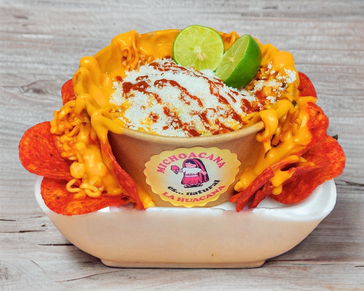 Deliciosa ramen Buldak con elote, queso amarillo, queso para elote, salsa, y papitas de tu elección.