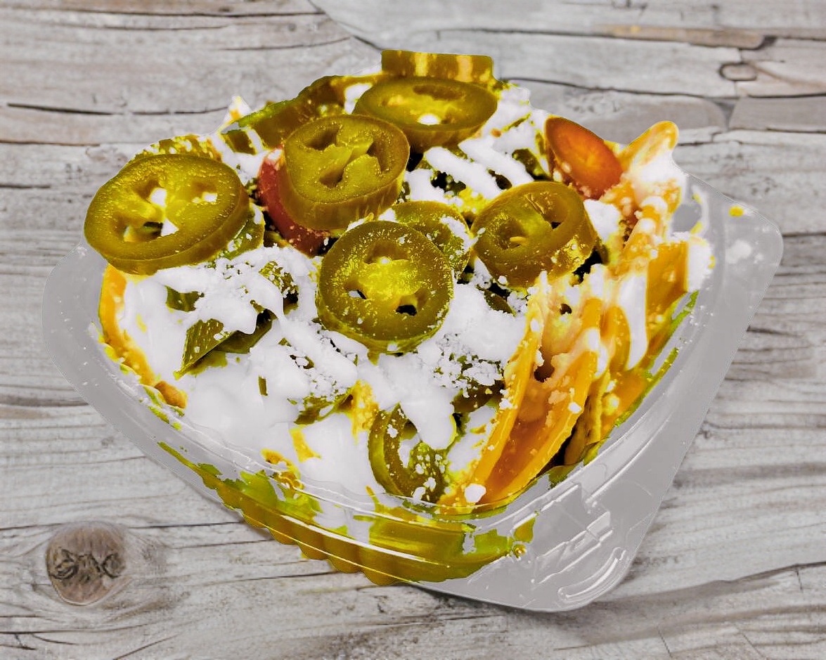 Tostitos Verdes o Morados, queso, frijoles, chiles curtidos y salsa (Se sirve en una cajita desechable).