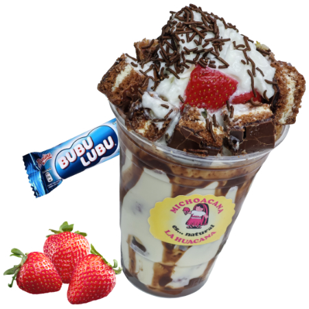 Chocolate Hershey's, Fresas Naturales Frescas, crema dulce receta de la casa, crema batida, pastelito Bubulubu cortado en trocitos y 1 topping de tu elección.