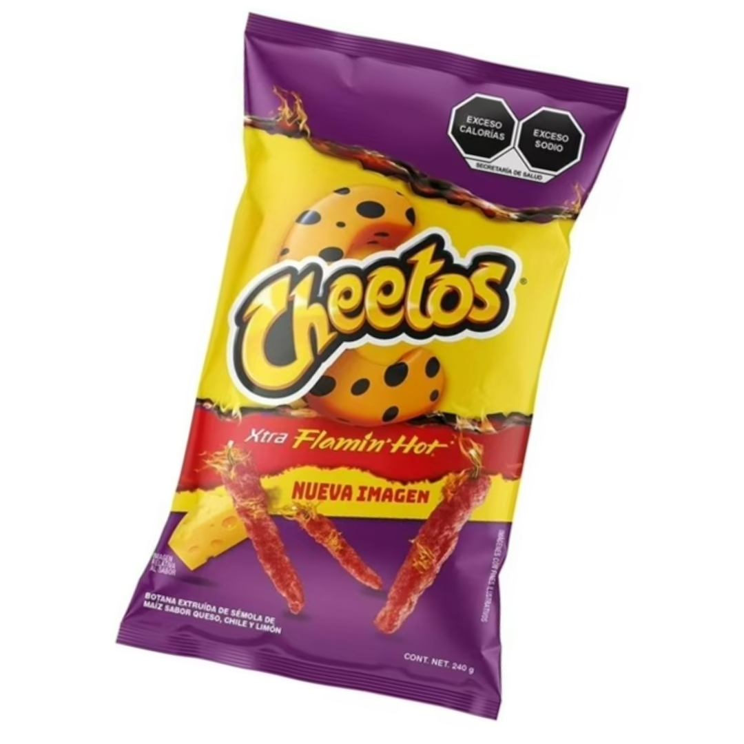 Cheetos Flamin Hot, queso, frijoles, chiles curtidos y salsa (Se sirve en una cajita desechable).
