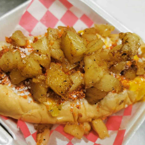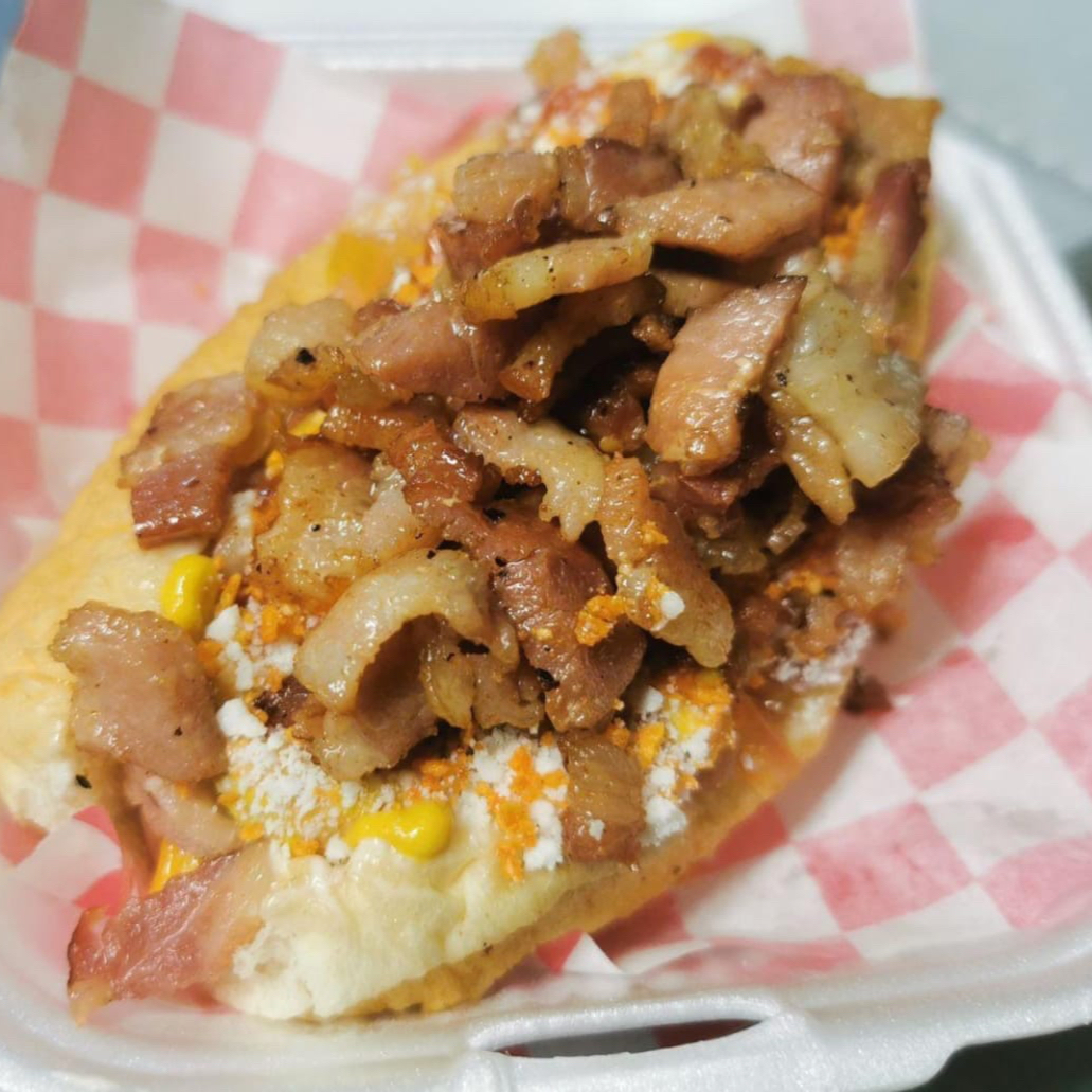 Pan grande , dos salchichas frankfurt, tocino, queso de Nachos, Queso de Elote, Dorito triturados, tomate, cebolla, pepinillos, mayonesa, mostaza y catsup.