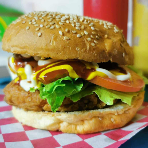 Pan, Pechuga de Pollo empanizada, lechuga, tomate, cebolla, pepinillos, mayonesa, mostaza y catsup.