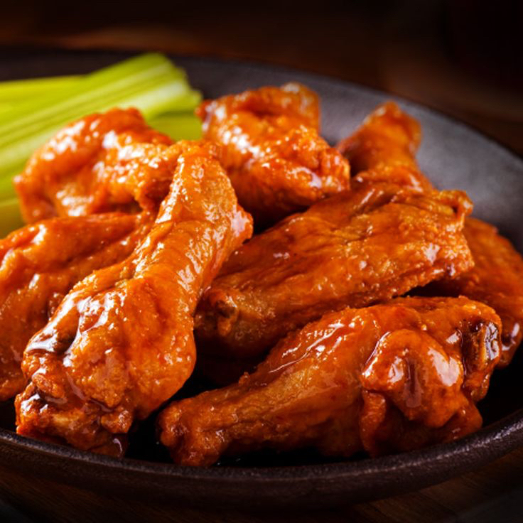 10 Alitas, bañadas con tu salsa preferida, porción de papas Fritas, verduras y Ranch.